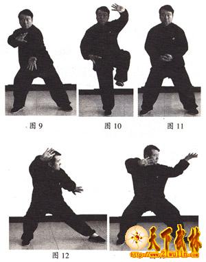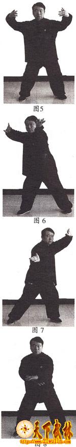肘 肘属艮卦,为东北方向,属土和足阳明胃经,意守的窍位是肩井。行功时,先蓄劲,气沉丹田,继而以意引气至上丹田,再以意引气由肩井向涌泉沉气;以意引气由涌泉上升经尾伺分由两肋上引经肩井,耳后高骨到泥丸宫为止,遂予外射。“肘”可调和足阳明胃经及所属脏腑机能,并可以降心经之火。 靠 靠属巽卦,为东南方向,属木和肝经,意守窍位是玉枕穴。行功时,以自己的有关部位(肩、肘、背、胯、膝等)贴靠对方之身,使之不能得力。靠时,以意引气,由涌泉上至尾闾经玉枕等穴,循行于小周天路线,其劲即向对方靠之部位发出。靠式可调和足厥阴肝经和相关脏腑机能。 以上八门手法,除意守相关窍位外,在行功时,须用腰腿劲再加以意气,这是行功的关键和动力。 五行步法就是进、退、顾、盼、定。 进步进步是指引气催身向前迈步,意守的窍位是会阴,属肾水。向前迈步(如循行)时,由涌泉将气提至会阴,提肛,收尾闾,以气催身迈步向前,前足踏实成定式时,意移前足涌泉,随之重心前移。如杨式太极拳之搂膝拗步,进步时脚跟先触地。 退步退步就是前脚向后退步,意守窍位是印堂,属火和手少阴心经。行功时,由涌泉提气直达印堂,引气催身向后退步,退步时脚尖先触地。如杨式太极拳之倒卷肱。 左顾右盼左顾右盼是以意引气分别着力于膻中、夹脊。行功时,假设有人从右边扑来,身即向左转,身向左转时,以意引气着力于膻中,催身而向左转动,如左云手;假设有人从左方向我扑来,即向右转身,转身时,以意引气着力于夹脊催身而向右转动,如杨式太极拳之右云手。 中定中定就是站于一地而暂时不动,意守的窍位是神阙,属脾土。行功时,重点着意于神阙,并配合手臂旋腰动作运气。中定步为变化之枢机,在十三势中非常重要。中定又叫“归土”。因土行居中,是水火木金划界的标准,水火木金的变化也是在土地上发生的,故曰“土布四围”,“土居中央而灌四旁”。传统医学中,脾胃为后天之本。中定步可调和足太阴脾经和足阳明胃经及相关脏腑机能。 五行步法中,就是两对相反相成的阴阳。水火两行,进步为水,退步为火,是讲阴阳相对,有进有退、一寒一热、一阴一阳,代表冬夏。故《内经·素问阴阳应象大论》说:“水火者,阴阳之征兆也。”木金两行,左顾为金,右盼为木,是讲阴阳相成,木代表春天,金代表秋天,春播秋收,有始有终。故《内经·阴阳应象大论》中讲:“木金者,生成之始终也。”在水火、木金两对阴阳中,一寒一热,一始一终,都是在土地上发出的,两对阴阳四行与土行合起来就叫五行。故五行是阴阳的推衍,是太极“含三合一”的具体体现。五行和八卦合起来,就是十三总势,即谓太极之真谛。太极拳就是八卦五行的综合体,行拳走架只有附介八卦五行,人体气血运行才最佳。气血通畅,经络调和,阴阳和谐,自病不生,乃可延年益人