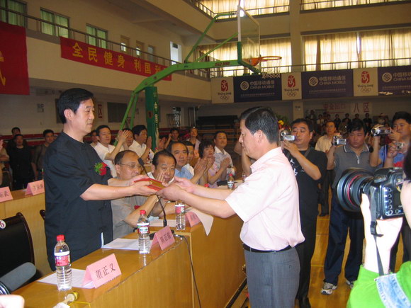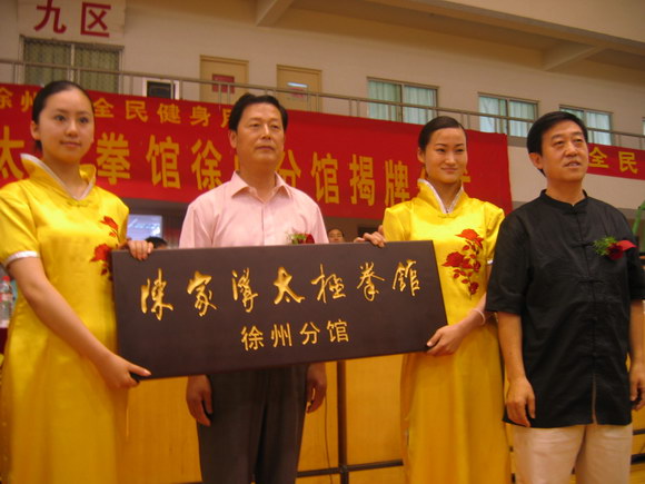 | 兵家之地爱武功,太极神功扬彭城。”5月20日上午,中国陈家沟太极拳馆徐州分馆揭牌仪式在徐州体育场篮球馆隆重举行。中国当代十大武术名师、中国武术八段、河南省武术协会副主席、陈式十九世太极拳第十一代嫡宗传人陈正雷大师及弟子一行十余人、徐州市体育局局长、市武术协会主席南建平、原徐州矿务局局长、九州大学副校长陈引亮等出席了揭牌仪式。在授牌仪式结束后,陈正雷一行及徐州市太极名家和爱好者数百人,进行了精彩绝伦的陈式太极拳、剑等表演,使在场的数千名观众大饱眼福,为之倾倒.