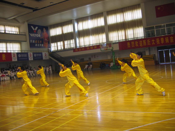 太极拳发源于河南省温县陈家沟,由陈氏第九世祖陈王廷依据易经阴阳之理、中医经络学说及导引、吐纳术,综合性创造的一套具有阴阳性质、刚柔相济、快慢相间、松活弹抖的特色,以及符合人体生理规律和大自然运转规律的太极拳。太极拳总馆出场的自然少不了在国内外享有盛誉的“陈家将”。继陈正雷大师的女儿陈媛表演完陈氏五十六竞赛套路之后,陈正雷大师的儿子陈斌闪亮登场。陈斌系陈氏二十世、太极拳第十二代传人,国家一级拳师,现任陈家沟太极拳馆主教练。陈斌表演的是陈式太极拳中比较复杂的炮捶——新架二路。陈斌步法灵活,以刚为主,刚柔相济以内劲为统驭,节节贯串,真正体现了刚中寓柔,力求坚刚,震脚发力,闪电腾挪,窜蹦跳跃,松活弹抖的特点,将陈式太极拳的精髓表演地淋漓尽致,赢得全场观众的热烈掌声。