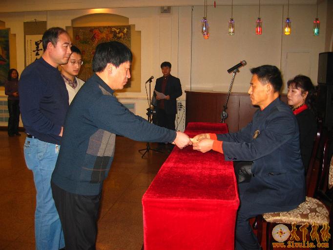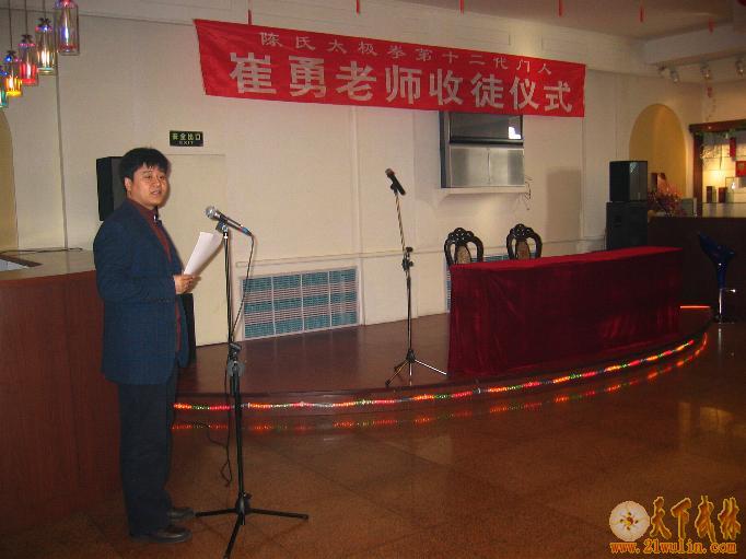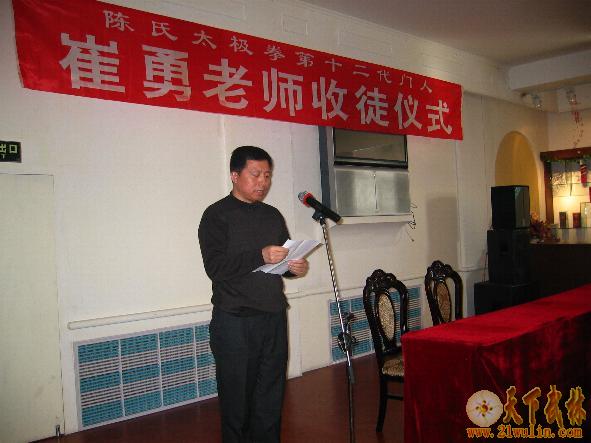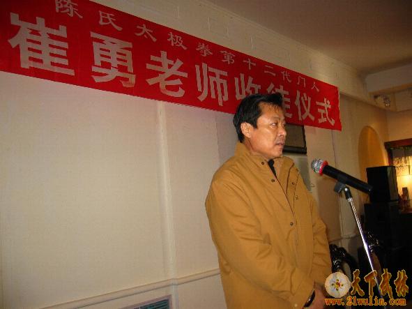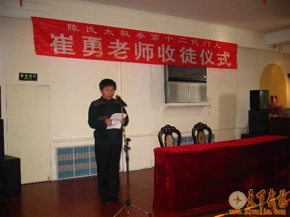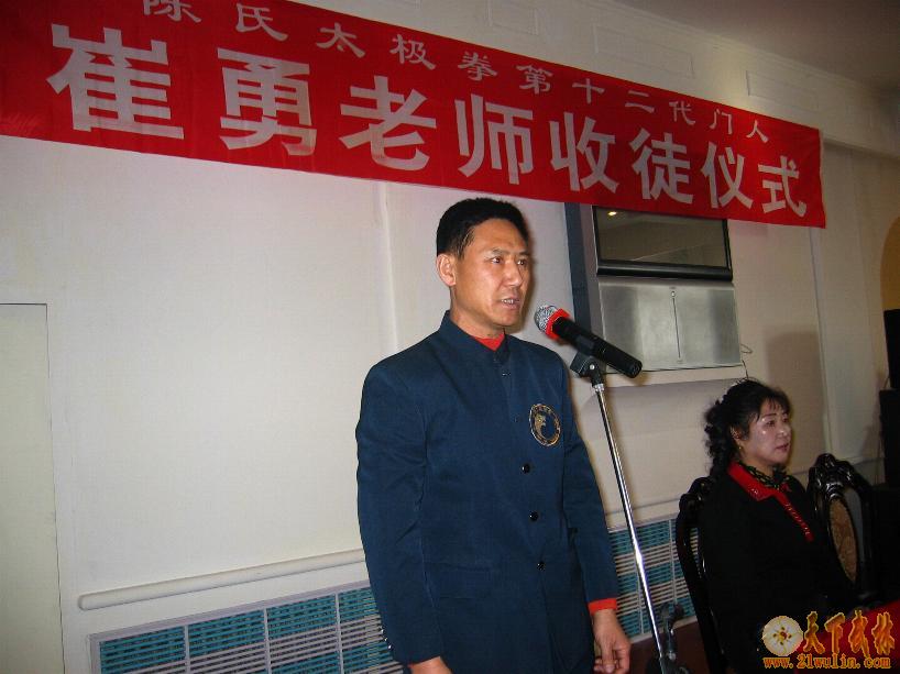 | 2007年2月4日,陈正雷大师亲传弟子、陈氏太极拳第十二代门人、《吉林崔勇太极武道馆》馆长——崔勇老师收徒仪式,在东方大酒店四楼宴会厅举行。中共国电吉林热电厂党委副书记、纪检委书记、国电吉林热电厂工会李磊主席到会并致词;吉林省武术协会副主席、吉林市武协主席、高薪开发公安分局王铁延局长作总结讲话;国电吉林热电厂工会周振伟副主席主持了收徒仪式。吉林省武协副秘书长、吉林市武协常务副主席毛继成处长、龙潭区武协主席林飞校长、副主席龙潭交通警察周景杰大队长、东方公司张伟总经理、国电吉林热电厂离退休管理部马世明主任、中共国电吉林热电厂离退休党总支董永海总书记、国电吉林热电厂工会文体委员徐伟中主任、东方大酒店于东经理等领导同志、崔勇老师的夫人薄秀芳女士和新老弟子代表以及摄影师、摄像师、电视台记者等30余人参加了收徒仪式。