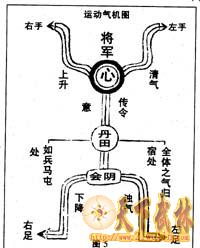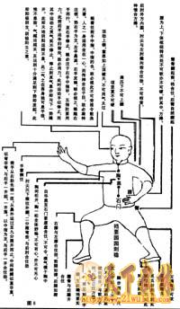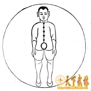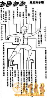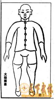 | 无极者,一物未有也。太初以上浑浑穆穆、混混沌沌,所谓大混沌者即此时也。学者上场打拳端然恭立,合目息气,两手下垂,身桩端正,两足并齐,心中一物无。所著一念无所思,穆穆皇皇浑然如大混沌无极景象。故其形无可名,名之曰无极象形也。 太极者生于无极也。谓太极已有形声乎?曰未有也,未有不曰无极,而曰太极,何也?然太极虽无形声而几朕已兆。如硕果之仁,生机将动未动,特生机未足而未出乎核之外耳。不然,天地何自而生乎。是大混沌后,阴阳虽未分,而分之机已动。一至于分则清气上升而为天,浊气下降而为地。但此时清气犹未上升,浊气犹未下降耳,故谓之为太极。是前人上推阴阳五行之机,未生天地,无可名称,名之曰太极。而要阴阳五行已俱备矣。打拳上场,后手足虽未运动,而端然恭正之中,其阴阳开合之机,消息盈虚之数,已俱寓于心腹之内。此时一志凝神,专主于敬,而阴阳开合,消息盈虚特未之形耳。时无可名,亦名之曰太极。言此以示学者初上场时,先洗心涤虑,去其妄念,平心静气,以待其动,如此而后可以学拳。 平素打拳因地就势,不必拘定方向而守一定之位置。但北辰北斗皆在北方,学者宜心向之,仰承天机人之中气,乃有真宰,故画图以面北背南,右东左西,定为准绳,以示规矩。 立天之道曰阴与阳;立地之道曰柔与刚;立人之道曰仁与义。 足容重,手容恭,头容直,目容肃,坐如尸,立如旗。 孔子曰:非礼勿视,非礼勿听,非礼勿言,非礼勿动。打拳时,执事敬,自然周中,规折中矩,而视听言动皆在规矩中矣。 未打拳时,心平气和,浑然一太极气象。将打拳时,神恬气静,至手足动时方能躁释矜平,运我太极拳中自然之天机,而从容中礼(拳皆有天理自然之节文)。 礼曰惰慢之气不可涉于身体,一涉惰慢动作必溢规矩之外,百病丛生矣。 礼心于敬,乐主于和。能敬能和,然后能学打太极拳。 或曰太极拳一艺也,如子之言立规太严,虽圣贤用功不过如是。一艺之末奚必然哉,余曰不然。 打拳亦所以修身正卫性命之学也,孟子曰:不以规矩,不能成方圆。 打拳之道,自始至终不外一个敬字。能敬则专心致志,自无鸿鹄之射,扰乱胸中。至于拳中法律一一皆详如左。 左阳右阴图 此第一势手足运转图。左手属阳内圈,左手与左足所运之圈。右手属阴外圈,右手与右足所运之圈。非更迭转实一齐运动。左手略先,右手略后;左手在内,右手在外。机之动,阳先阴后;运之势,阳内阴外。 此图如万物阴阳交合之意,阴阳一端之用。 运动气机图 孟子曰:“志者,气之帅;气者,体之充。”心如将军,气如兵,将军一出令,则士卒皆听命。清气上升,行于手;浊气下降,行于足。气皆行到指头乃止。气之上行下行,似两橛,其实一气贯通也。 气机行于肱内皆缠丝劲。言手而足在其中。 (图1)此形内劲由肩臂而行于指甲。 (图2)此形内劲由指肚而收于腋肩臂。第一图是出劲,第二图是入劲。 (图1)胳膊劲由心发,行于肩,过肘至指,此是顺缠法。由骨至肌肤,由肩至指出精也。(图2)由指至肩倒缠法,所谓入精者引之而来,使敌近于我也。 两腿之劲皆由足趾领起。上缠过踝、过膝至大腿根两腿根间,谓之裆,即会阴穴也。运动足后跟踏地渐至趾通谷、大钟、外腓以及隐白、大敦、厉兑实实在在踏于地上。 何谓金刚捣碓?金刚神名,钢如精金百炼,坚而又坚。其手所持者,降魔杵也。捣碓者,如谷之在臼,以杵捣之。右手将捶如降魔杵,左手微屈如碓臼。既取其坚刚沉重,又取两手收在一处以护其心。故名。 打拳以鼻为中界,左手管左半身,右手管右半身。各足随各手动之,心身不可使气,轻轻运动,以手领肘,以肘领臂,手中之气仅仅领起手与臂而已。不可过,过则失于硬。上体,手如何运动,下体亦随之上下相随,中间自然皆随。此为一气贯通。上场立必端正,两手垂下,两足并齐,两膝微屈,裆劲要开、要虚。裆开,然后心气发动。先以左手领起,左足往前进半步,遂以右手领起右足,右手自下由左手外绕一圈上去。两手套住,如转环转一圈,右手落在左手掌中,手与心齐,一齐停住。右手与右足皆虚虚笼住,左手与左足皆实实在在踏于地上,如土委地。百会穴领其全身,要使清气上升,浊气下降。清气如何上升,非平心静气不可,浊气必下降。至足一势既完,上体清气皆使归于丹田。盖心气一下,则全体之气无不俱下。太极拳自始至终,独此一势是正身法,端而肃,实而虚,柔而刚,上下四旁任人所感皆足以应之。此所以领袖群着,而为之首理,实气空圆转自如浑浩流行,绝无滞机。每一势完,仍归到浑然一太极气象。绝无迹象可寻,端绪可指。外似停止,而内无间断,此太极之所以为太极也。 两大腿根要开,裆开不在大小,即一丝之微,亦算得开。盖心意一开,裆即开矣,不会开裆者,腿虽岔三尺宽,不开仍然不开,是在学者细心参之。 打拳之道,不外一圈圈有正有斜,有左有右,有缓有急,有阴有阳,有有形有无形,皆因现在所运之势而循环不已。盖人得阴阳之气以生,是吾之身即太极之身也。以无形之太极,宰有形之太极,人皆知之。至以有形之太极,行吾无形之太极,而反矫揉造作,不因其自然而然。何也?是徒知炼气,而不知自然行止也。又如人之目,昼则开,夜则合,一开一合,皆太极自然开合也。拳中一起一落,一合一开,何?莫非从太极来乎?但习而不察耳。 打拳何尝不用气,不用气则全体何由运动。但本其至大至刚之气,以直养无害焉已耳。世人不知,皆以为柔术,