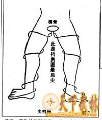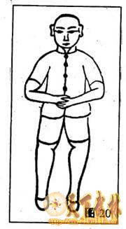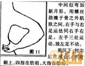 第二势揽擦衣 周身一齐合住劲,且周身骨节各处,与各处自相呼应而合,如手与足是也。每一势自有宾主,如此势右手与右足是主,左手与左足是宾。每着全在心胸,用心太过失之拘束,不用心失之懈怠,是在有心无心之间。一主以敬方能得乎,中道运动咸宜。 左手在西,右手初运。左手亦随之先转一小圈,然后自下而上转一大圈。涉下至左肋,岔住腰。凡人自幼用右手居多,用左手少,故左手较右手稍笨。打拳凡于左手虽不当令,亦宜格外留神。必使左右手一齐运动转圈,气力方能匀停。 中间似弯如新月形。用螺丝劲缠于骨之外肌肤之间,右手与右足运法同右手右足。左手三处运动,独左足不动。 此右手已成之势内劲图 右手以中指为主,五指相依,勿令散开。肘尖向南,肘弯向北,胳膊微弯三四分。内劲似停不停,中指领左,右四指往则合往劲。近与右肩为呼应。远与左手为呼应。 肩沉下,肘尖后往前合。手背朝上,四指在肋前,大指在肋后。 右随右运趾先一圈,足住手动,足亦划小 何谓揽擦衣?揽者如手揽物,擦者如手挨著衣者上衣,形如以左手揽物,挨著衣服。言左手岔住腰,肘微向前合。大指与后四指岔开,手从上腕斜下。其意似往下按,手掌向后岔住腰。左手属阳,肘屈似阴,是谓阴中藏阳。右手从上,腕自上往右向下而左绕一圈。再往上,然后向右徐徐而发,越慢越好。高不过鼻,低不过肩,手走到九分而止。内劲不前不后,由中而行。后则擘,前则合,皆不得中劲。以中指为主,中指劲到,余指劲皆到。皆由心中发起,越乳、过腋、入肩、膊内、骨中,由骨髓充肌肤,徐徐运行。待其劲行到指头肚,然后手与和合,肘与肘合,肩与肩合,膝与膝合,足与足合。说合,则两半个身上下一齐合住。当中裆劲开开,又要合住,是合劲,寓於开劲之后非,开是开,合是合,开与合看成两股劲。右手动,右足绕一圈,随着右手一齐运动,一齐行止。右手将停,右足踵先落地,由腓及五足趾依次落地,放成八字势。以两足论,右足在前是主,是宾中之主;左足在后是宾,是主中之宾。以右足是左足留守不动,故也。右脚虚,左脚实,为为前虚后实。以一足论,亦是前虚后实。脚趾、脚掌要抠住地,涌泉要虚,不虚则趾不著地,用不上力,是为前后实,中间虚。腿劲由足大趾上行,外踝向裹缠斜行而上,过三里越膝、逾,血海至大腿根。左腿内劲缠法亦然。两腿劲同往上缠绕至会阴(穴名),两阴卵中间中弦而止,盖两劲对头是其结穴,此处是腿劲归宿。腰劲稍往下降,降至此,腿根撑开,裆劲自圆腰中要虚,一虚则上下皆灵。 胳膊大,皆用螺丝缠劲,断不可直来直去。一直则无缠绵曲折之意,无缠绵意不惟屈伸无势,即与人交手亦不能随机应变,妙于转旋转关。不灵,在我先觉输人一筹,何以制胜?即令硬气可以胜人,人自心中不服。 此图上已图之,言之最详。但学者不用功则已,一用功心即忘之。故不惮再图,烦言以晓之,欲令其默认(去声记也),心通念念不忘也。由肩外缠至中指甲,是进行劲。由中指过手背,外往里缠通行至肩,是引劲。由远而引之,于近初发用进行劲,里收用退行劲。下体劲自足趾至腿根,进行、退行皆由足上行。与胳膊异者,是自己用功确不可移。如此,至于与敌交手,敌来侵我,先引后进,亦是确不可移。须记,右手运到九分时方停,神气更贯十分满足,此处最难形容。由起至止,须慢慢运行。能慢尽管慢,慢到十分功夫即能灵得十分。惟能灵到十分火候斯,敌人跟不上我,反以我术为奇异,是以人之恒情也。殊不知,是先难之功之效也。又全体先斜后正,外斜内正。斜者其形正者,其精以心中之中气运乎四肢之中。是人所不见,己我独知之地。须时时神而会之,久而自明。手足用动,要束而不散,束则神聚而凝,散则神涣而惰。总之,官骸皆听命于心,心一敬谨,手足自然如法而行。肩要压下,肘要沉下,右手领住,左手岔住腰,胳膊屈住,是乃此着最要。形势、眼神随右手运如此着,右手当令,眼神只随住右手。右手运到地位,眼神即注在右指甲上,此中指即眼视之标准。肩、膊、头、骨缝要开,始则不开,不可使之强开。功夫未 到自开时,心说已开,究竟未开。必攻苦日久,自然能开,方算得开。此处一开,则全胳膊之往来屈伸,如风吹杨柳,天机动荡,活泼泼地毫无滞机,皆系于此。此肱之枢纽灵动所关,不可不知。右手与肩平,不可太低,亦不可太高。低则中气运之难,恐运不到;高则肩膀胳膊无力。总以得中为贵,顶精领起来(顶精心之中气领如提起)顶精何在?在百会穴。其意些须领住(领是领其全体精神,令其不偏不倚),就算不可太过,过则下棚上悬,立不稳当。此是一身关键,中气之所通者,不可不知。中气上通百会,下通二十椎。此处一通,则上下皆通,全体之气脉胥通自无倒倾之弊。脑后二股筋是佐中气之物,二筋之间其无筋处乃中气上下流通之路,下行脊骨之中,至二十一椎止,即前后任督二脉,亦皆是辅吾之中气。中气最难,名即中气,所行之路处亦最难名,无形无声。非用功夫久,不能知也。所以不偏不倚,非形迹之谓,乃神自然得中之谓也。即四肢中所运之中气,亦即此中气之旁流,非另有一中气。此处不偏,而后四肢之中气皆不偏。虽四体形迹呈多偏势,而中气之流于肢体中者自是不偏,此意第可神而明之。项要端正竖起,如中流砥柱,不前不后,不左不右,不至倒塌,方得。此势右手运行,以右为主,为其向右应敌也。右手属阴,其运行者阴中之阳。而其所以运之者,有宰