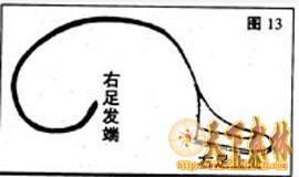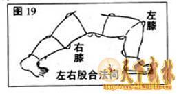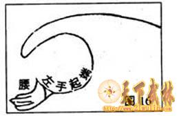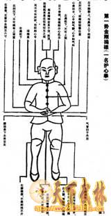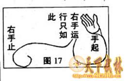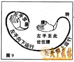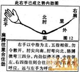。 左肱以肱弯与右肱相合。 左手起 中间胸腹自天突穴至脐、下阴交。气海、石门、关元如磬,折如鞠躬形,是谓含住胸,是为合住劲,要虚。 右肱反背势与左手相合。 圈内线即右手发端。右手发端先转一小圈,右手束。 足缠丝劲图