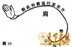 此为左右相合,是上势之下,下势之上,两势间过脉。 左手指展开,指并住,舒肱。左手转一圈,以下西行,舒肱。 左手离腰上行 此是未运行手,先转一小圈,与右手合住。 此是胳膊劲,手转够一圈,背微向前。 左手展左手止此图仍以面 向北,图之故。左右与上同。 此左手运行图