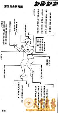 如敌人制我右肘,即以右肘向左引之回而击之。制我左手,左手在左即以左手向右引而击之。制我左右手,即以左右手向右引之。此势但形引劲,未说到击人处。 此与下一势界限分处。此势以引足为止,学者多性躁,未下工夫,先好打人,不知侵到何处即以何处引击。不拘定格,聊举一二,以示之不轻言,恐起学者躁心,不下工夫,故不轻言。前图宜用意默会,切勿淡漠视之耳。 何谓白鹅亮翅?如白鹅之鸟舒展羽翼,象形也。以右手领住左手,先下降至左胁前,去胁七八寸许,先绕一圈毕,再以左手领住。右手斜势,由下逆行而上向右边去,只绕大半个圈,如鹅展翅之形,似停不停。右足向右行,亦绕大半个圈开步约一尺有余,右足趾向北,平实踏地;左足随右足行到右足边,脚趾点立于地,亦伏下势开步之易,左足虚,右足实,中间胸向北西(解见前)。胸中内劲如太和,元气旋转先自右向下向左逆行而上,从左而右转够一圈,与手足一齐停止。右手过首在右,距右耳尺许;左手随右手运行至鼻前,左手斜朝上,去脸七八寸许。左手与右手相去一尺余,眼看住两中指,顶领项直,沉肘压肩,胸含住,屈膝开裆。左足虚倒立,右足平踏地。此势虽名为一势,实半势为,其钝是引进落空(去声)意。且尽是开意,无合意,必与下势合成一势,大局方得停住。