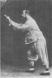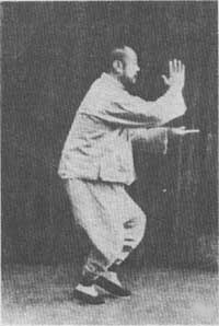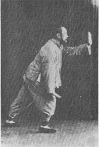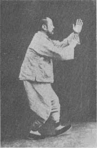 此势同前提手上势不同之处有二:其一是由单鞭势后而作提手上势,此为大斜飞式之后向前弓腿而进的;另一是坐腿而上的。