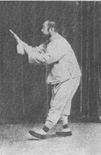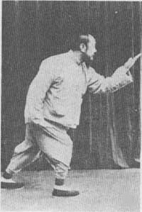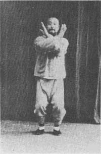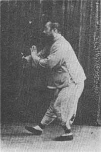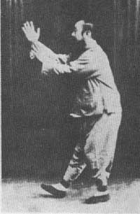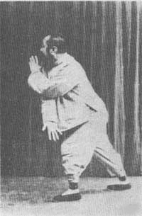 说明:退步打虎势乃防御动作,两手错掌披面打出,连随退步右腿起脚,这是以退为进的御防法。老架子有左右打虎势,现取其一。