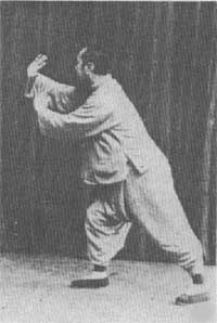 上步搂膝打在阴,松肩垂肘气下沉;力由脊发须完整,手腕肘肩混合一。
