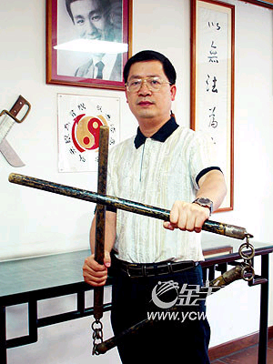 李小龙纪念馆馆长黄德超展示李小龙的三节棍