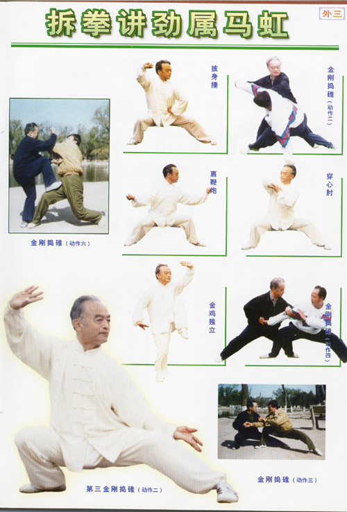 拳架之外,还要练单势、练推手、练器械以及辅助功力练习。练单势.就是从拳架套路中,抽出来若干个难度较大或在实战中常用的动作,单独练习。比如,“披身锤”有7个分解动作,至少含有18个劲。单势训练时,除拆解这7个分动作外,还可着重训练动作四、五中的“右采左击,右棚左采”;动作七中的“左脚左膝里扣、左肘里合、右手上引、右肩后靠”,四劲合一,并且要把这些动作分解后交替练习,不合规范不练下一个动作。拳架套路是若干个单势的组合,单势动作训练有素,练习拳架就更充实、更有神韵了。