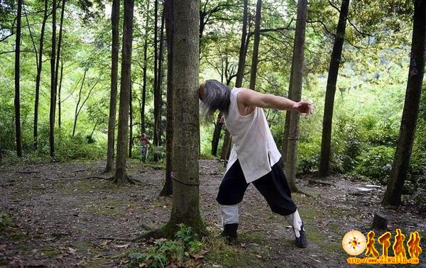 何道君用头撞树。何道君1963年生于四川成都的工人家庭,这位武痴四、五岁的时候为了练就钢筋铁骨,就成天撞树、撞电线杆,有人开玩笑,如果旁边有一只大肥猪,他也一定要将猪撞翻。
