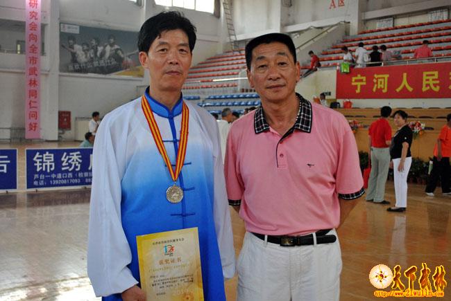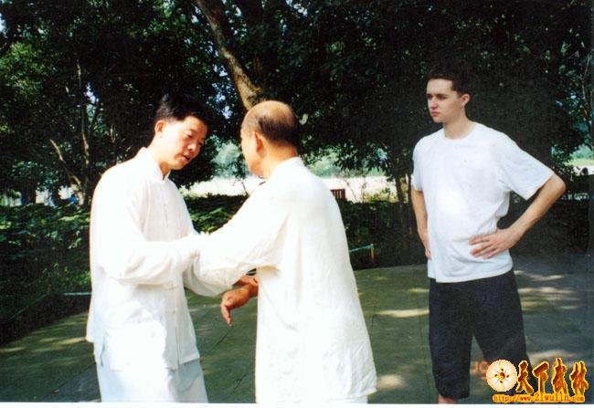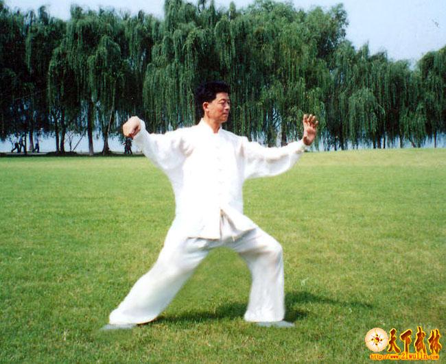 一、论太极 在宇宙爆炸中,地球横空出世,天地合气,万物滋生,适者生存,人类最终脱颖而出。 “人法地,地法天,天法道,道法自然”。从这种意义上讲,地球是个大太极,人是个小太极,万物都在运动中,按一定的规律变化。地球在围绕太阳的公转中进行自转,使自身得到相对的稳定。斗转星移,昼夜交替,四季更换,八卦代表着自然界万物的相互关系。 太极拳则以无声的运动形式,演绎了阴阳变化。从无极到太极,又回归到无极,太极拳在运动中,由阴阳二极产生四象,由四象产生八卦,八卦表示八个劲别,在运动中而产生各种变化。 当我们将一枚硬币,立在桌面儿上用手一捻,使其旋转起来,此时会看到硬币中间出现一条明显的中轴线。硬币围绕着这中轴垂线对称旋转。这种现象证明:物体可以在对称的转动中得到平衡,物体的重心垂直于支承点,得以稳定。当物体重心倾斜而偏离中垂线,就开始失稳,一旦物体斜坠的重量,超过它的支承能力,就会跌到。 人也同此原理。区别在于人具有主观能动性,当感觉到身体要偏斜时,能够及时调整身形,获得平衡。如果人的双脚把住地不动,让身体转动,当转到一定幅度时,就自锁,不能再动了。这是由于人的双脚着地,不同于一个点接触地面的缘故。 太极拳适合人的身体结构,通过它的转动方式和两腿交替变化虚实的方式,达到圆活运动。 假如,我们设定身体从左向右运转。首先腰先逆时针转动,当劲传到左脚,以左足跟为轴,经左腿到胯,再顺时针传到右腿至脚。其路线如同一个“~”,将重心移到了,右腿。再从右脚向左腿运行,方式相同,唯方向相反。在运动中,将身体的支撑从右腿移到左腿,运行路线是一个反向“~”,把一往一复的运行路线合在一起,正是个“∞”形路线,就是说,太极拳以“∞”形路线解决了人体的转动问题。 那么,“∞”形路线与太极拳是什么:关系呢?可以说是正反两个“~”形组成了完整的一个周期。谓之“一阴一阳一太极”。 对照太极图,假设全身为一个立体圆,双脚为支撑点,双脚之间的横向距为直径,画一个圆为底盘,身体则在此圆中沿着正反的“S”路线运行。此时,“S”的轨迹为圆底盘对称的分界线,恰恰勾画出一对阴阳鱼形。鱼的图形又示意身体重心的渐渐移动的,移动过程也是“虚、实”互动变化的过程。 太极图的鱼眼则表示,重心腿一侧“实中含虚”,而虚腿一侧“虚中有实”。 值得注意的是,实际应用上“虚”、“实”变化是交织在一起的。不像示意图那样泾渭分明,但也绝不是混淆在一起的。不谙此道,就会因概念上的公式化,造成机械式动作,运动中出现犟成一体或散懈现象。 “往复要有折叠,进退要有转换”,为达到太极拳的运动“中正安舒”的效果,在周身姿势合乎要领的前提下,沿太极“s”形路线来回运动。当运行到极点,转身回返时,松展的身体各部,尤其膝、腿需要较大的弯曲度,在转绕中过渡转方向。可见“折叠”与“转换”是相互关联的,二者融为一体。 这种以腰率领身体螺旋运转的方式,在缠绕中将松沉的身体徐徐拧成一个撑圆的有机的整体。当腰逆时针转动,经左胯、左大腿、左小腿至左脚掌外侧,以此劲缠碾于地再借地的反作用,经足跟缠出,再变成顺时针旋踝转膝,劲从左腿传至左胯,推动右胯至右腿,形成转膝旋踝之劲,将身劲经右脚缠至地下,这样,右腿为主支撑身体的重心,以上完成了从左腿到右腿的虚实转换过程。而从右脚到左脚的重心转换的方式与此相同,但方向互易。如果从左到右移动重心为进,从右到左返回为退。从物理角度上分析,进与退有着本质上的区别。进时呼气,退时吸气,进依靠动能,退利用势能。 太极运动包含相反相成的原理,具体地讲,当左腿逆时针旋转时,促成右腿顺时针旋转,形象的比喻,如同齿轮的啮合运动。当主动轮正转,驱动从动轮反转。在对斥互动中完成机械传动。拳架利用螺旋转腰,使全身旋拢成一个有机的整体。螺旋的角度造成两脚一正一反先后着力,使二腿对撑经胯运转,这就造成全身合中有开,开中有合,全身在互推互挽中运转,“对立统一”促成身体的运行。 太极拳要求四肢百骸松而不懈,在意的统帅下,协调一致。并要求意、气、形相合,进中含退,退中有进,腰带领全身缠绕,又可促使根节催动梢节运行。太极拳存在很多门派,根据需要有不同的练法。在养身修性时,可盘出松沉匀稳的架子,内气连绵,黏稠委婉如抽丝,让人产生超脱陶醉之感。在竞赛表演时,既要动作合乎规范,又要舒展大方,刚柔相济、飘逸流畅。在搏击时,收拢身形,从容以待,在酌情度势中换招变势,闪战腾挪,吞吐之中,分出胜负。 还有各种练法,不尽相同,但是万变不离其宗,太极的柔、整、圆、活,迂回往复,内气鼓荡……淋漓尽致地发挥出来。 二、太极内功 经过长期的站桩、打拳、推手等训练后,对太极拳的各种要领掌握了,丹田气充足了,再打通经脉,能够丹田内转,在意的支配下,采取腹式呼吸,带动呼吸的起落,使动作内气浑然一体,形成内气能随动作在体内循环,带动打拳。以意行气,以气运身。形与气的内外相合,以内促外,以外带内,相辅相成。内功是太极拳的精髓和灵魂,内功能够使身体保持长久的耐力,武术前辈一直把它作为护身的法宝。 “拳不敌招,招不敌功”,二人在搏击时,拳术可被手法化解,但招法对太极内功无法抗衡。高手过招,出手见输赢,这是因为内功起了决