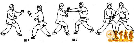 1、在临阵实战中,敌我双方均采取左小开门式迎敌,相互对峙,以目注目(图1)。