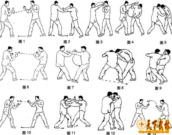 1、我左式与对方右式对峙(图10)。2、对方进右步,用左直拳猛击我中盘或上盘。我速用左手向左后方拨带对方左臂(图11)。3、动作不停,我两脚向对方中门裆下逼入,同时左臂内旋,用左手抓住对方左上臂向左推,右掌亦猛力向左推其左肩膀或左肋部,使对方侧倒(图12)。