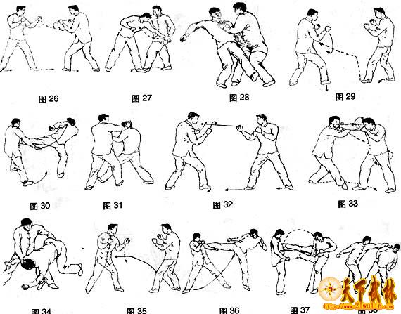 1、我左式与对方左式对峙(图26)。2、对方进左步,用左直拳击我中盘。我左脚微后撤,向 左拧腰闪身,左手向左拨开来拳,就势刁拿其左腕,向左后方猛拉,同进右手托抓对方左肘(图27)。3、对方左臂被拉,急忙用力向后回挣,我即右脚上步至对方左脚后面,脚尖内扣,以我右脚扣住对方左脚,同时用左掌猛推其胸部,使其后跌(图28)。