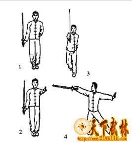 两脚:剑起动时,右脚前进一步,转脚尖向南,再将左脚由北向西移半步,即以两脚掌向东拧转,使两腿作交叉形,两脚尖都转向东而略偏于南。