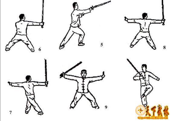 右剑:先用腕横转剑锋,回指西南,反掌(掌心向西,大指向地)、屈肘、横臂、竖肱、引贴于胸部,然后倒锋刺向西南下方,袭击敌人的脚背。