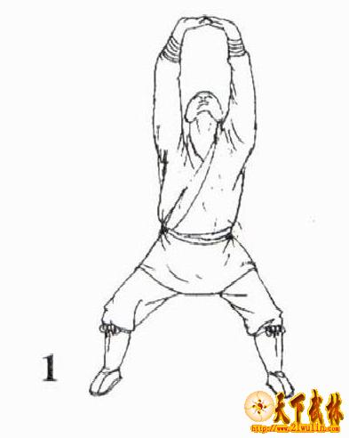 两臂徐向左右挺直,两掌举起,经过成一圆形,候手举至头顶,十指互叉转,掌心向上,如托千斤重物。手须尽力上抑,两目注视掌背,庶运用颈腭。