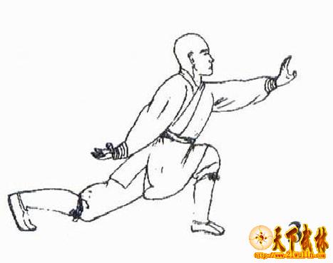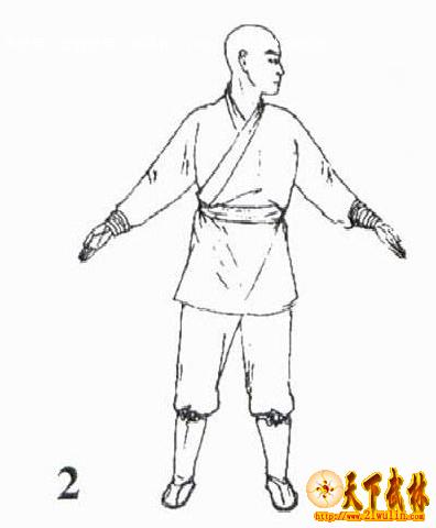 两足左右分开,成骑马势,胸挺出,身不可前倾。两拳握紧,各置腰际,掌心向上,目前视。