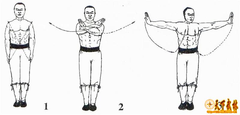 2?郾两手成掌,由体侧直臂向前上举,在体前屈肘交叉,左手在外,右手在里,两掌心均向前,指尖向上,二目平视前方(图2)。