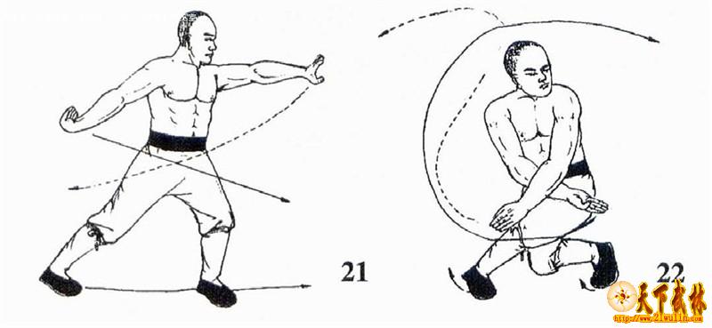上体稍含胸前倾,左腿屈膝后收,落于右脚内侧前,脚尖点地成左丁步,同时,两手变拳,向后拉于身体右侧,左臂屈肘收于腹前,拳眼向上;右臂伸直摆于体后,拳眼向下,二目平视前方(图18)。