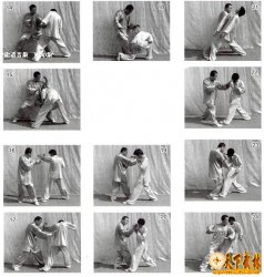 移位闪战法是闪战之一种,它是通过步法的前、后、左、右变化,避开对方的强有力进攻,然后进行及时反击的一种方法。 一、单腿让位法 1?郾吞身让位 对方两脚向前上步,以右冲山炮发动猛力攻势,我左脚迅速向后吞身撤步,左手扣按对方右手臂,使对方右拳落空;随即我左脚