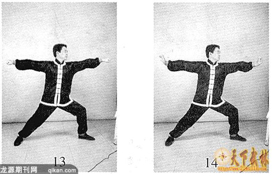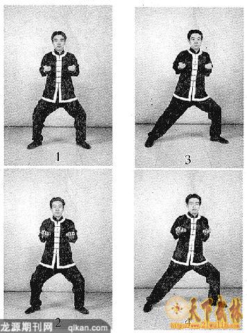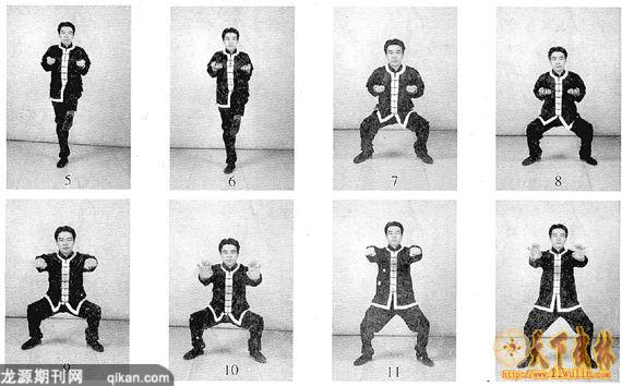 主要采用正蹲马势。身形正向,两腿适度弯曲,膝盖同时向前,两腿高低相同,全脚掌着地,双脚尖自然外分。双臂弯曲,两手收至左右胸侧,若是拳形则拳心向上拳面向前,若是爪形则爪心向上虎口向外(图1、2)。站好马势静止不动,提起精神调节呼吸,先高后低,尽量坚持久则为功。为了同时练习桥功,可将手臂正前伸开。 ②弓马法 两腿左右伸开,一腿适度屈膝,全脚掌着地,脚尖向前;另一腿在后,膝节伸开,全腿蹬直。双臂弯曲,两手收至左右胸侧,若是拳形则拳心向上拳面向前,若是爪形则爪心向上虎口向外(图3、4)。提起精神,调节呼吸,静耗增功。左右势互相变换练习。为了同时练习桥功,可将手臂左右伸开。 ③吊马法 一腿屈膝提起,另一腿伸直单桩独立。双臂弯曲,两手收至左右胸侧,若是拳形则拳心向上拳面向前,若是爪形则爪心向上虎口向外(图5、6)。静练不动,提起精神,调节呼吸,坚持为功。左右腿互相变换练习。为了同时练习桥功,可将手臂左右伸开。 2.四平蹲马功 ①基本法 高马功练好了,就要降低马势增加功量。将正蹲马的双腿下降至大腿前后横平、膝胯同高时,就叫四平蹲马势,即腿平、头平、肩平、脚平(图7、8)。 四平蹲马功是功力拳最重要的马功练法,其对桩步的稳定和桩力的耐久,以及整体实力的增强,具有极大的作用,一定要多练常练。初练时虽练习几分钟就会双腿酸疼、呼吸急促、难以支撑,此是必然现象,练功者一定要坚持,千万不要弃之不练,久则自如而功效显著。 为了同时练习桥功、手功,可将双臂正前伸开(图9、10)。 ②加重法 加重法是比较传统的练法,以四平蹲马势再在大腿上面加一石锁或石块练功。此功极难练,非功力深厚者无法修习。 二、桥功 桥功,也叫“铁桥功”,即我们常说的“铁臂功”。 1.基本法 ①正桥法 选用高势正蹲马,身形正向,两腿适度弯曲,膝盖同时向前,两腿高低相同,全脚掌着地,双脚尖自然外分。双臂正前伸开左右平行,手与肩同高。手形为拳或爪,若是拳形一般拳心向下、拳面向前,若是爪形一般爪心向前、手腕挺起、虎口向里。静止不动,尽量坚持,久则为功(图11、12)。 久练后下盘可在高蹲马势基础上变成四平蹲马势。 ②侧桥法 选用弓马势两腿左右伸开,一腿适度屈膝、全脚掌着地,另一腿在后膝节伸开、全腿蹬直。双臂左右伸开与肩同高。手形为拳或爪,若是拳形一般拳心向下、拳面向外,若是爪形一般爪心向外、手腕挺起、虎口向里。静止不动坚持为功。左右马势互相变换练习,桥形不变(图13、14)。 2.铁环法 使用铁环练功是南派少林功传统。铁环法是功力拳练习桥功最常用的练法。打造大小、轻重适中的铁环,能够套上手臂即可,不要过大,过大铁环易晃荡不定影响练功。练习时把铁环套于双桥可增强桥的抵抗力。 ①静练法 先练静势,静练主要有两势,一为蹲马正桥法,一为弓马侧桥法。除桥套铁环外,练势与本节基本法之正桥法、弓马侧桥法相同。 ②动练法 再练动势,动势分单桥法和双桥法两种。 单桥法:用铁环单练一桥,可单桥上下起伏、单桥横向摆动、单桥圆形绕圈。 双桥法:双桥同练铁环,可双桥上下同时起伏或一起一伏、双桥左右分合、双桥圆形搅动。 3.碰硬法 碰硬法专门练习桥的硬力,功成后双桥如铁不畏重击。 ①单人法 自碰法:初练时以两桥互相碰击,陈师称作“自碰法”,方便易行,尤适合于桥硬不够、功力不足者。 碰木法:用桥对准木人的手臂或柱身,上、下、左、右、里、外不断地碰击以增强桥的硬度。没有木人可栽一木桩或自制一木架,也可直接碰树,但碰树一般不便上下使力。 敲碰法:此练法可供选择,即我一手拿短木棍向另手桥敲击。 ②双人法 助碰法:与武友互相碰桥,不需练功工具,两人可同时增加功力。 打碰法:让人手持硬物,如木棒、木板、铁棍、铁板、散竹等向我抡来,我以桥碰硬。此功法不易操作,若助手使用力度不当易受伤,请学者慎行。 三、手功 南功力拳不用掌法,其手功主要是“豹拳功”和“虎爪功”,以拳功为主。 1.变手功 变手功是手功的辅助功。手形忽拳忽爪忽握忽开,可慢可快,既能疏通气血利于手功操练,又能增加手法变化的熟练度及增强拳爪的基本功力。 2.豹拳功 ①沙袋法 制作大小适中的沙袋挂在墙壁上或单独吊起来,用于练习各种拳法以增强手上硬功。打击时双拳要握紧防止伤手,除静桩单练外可再加上步法配合练习。 ②木人法 木人功是南派的惯用功法。用各种拳法打击木人可求手硬,还因其接近真作实战更易增加练者的技击实力。 先练静马单力,再练连力,最后变马加步。练功时应由轻到重、由慢到快,不可急躁以防受伤。初练时可在木人上垫些软物,没木人者可用砖块、石块或直接打击墙壁。 陈师傅教徒弟练功时,给木人再加上一种外用布、内用沙缝制成的外套,既利于发力,又不易伤手,是个不错的方法。 3.虎爪功 ①沙袋法 单双爪交替抓扣大小适中的沙袋,先用小袋再用大袋,逐渐增强爪上基本功力。 ②木臂法 单双爪交替捕抓或缠拧木人手臂以增强爪上实战擒制力。先慢练再加力,一定要防止爪筋受伤。没有木人者可选择树木或木棍等。