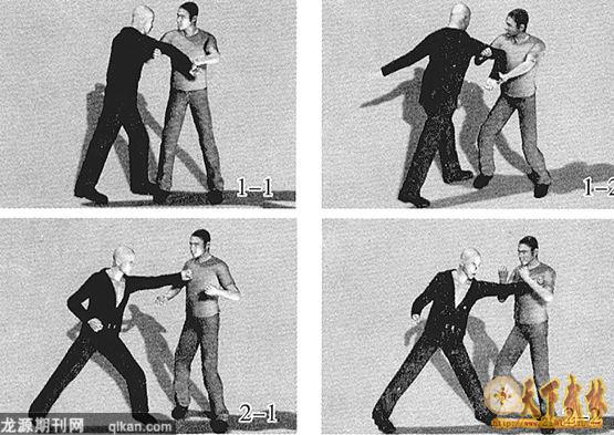 动作说明:双方对峙,对手左脚在前右脚在后,突然用右拳击打我腹部。我可迅速用左手由外抓住对手之右手腕,虎口向下,力达指尖,同时右臂伸出,将右小臂伸入对手右臂下方,钩住其右大臂(图1-1),紧接着左手向下方推按,右小臂向上提挎,并稍向右转身,双手协同动作以别拿其右臂肘(图1-2)。