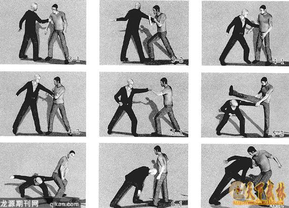动作说明:双方近距离交手,对手左脚在前右脚在后,突然用左手由侧面掏抓我右侧软肋(图4-1)。我可以迅速用左手自下而上抓住对手之左腕,同时右臂自下而上挎住对手左肘关节外侧,左手向下按压,右臂向上提拉,两臂交错用力以别拿其左臂肘(图4-2)。