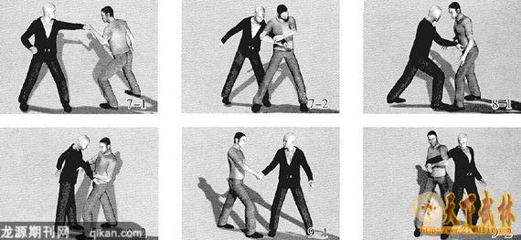 要领解析:左手扣按对手右手一定要牢固,右臂上屈时要以小臂外侧为力点别压其右腕外侧,要以转体带动上肢动作,动作须连贯,劲力饱满,一气呵成,切勿动作脱节。