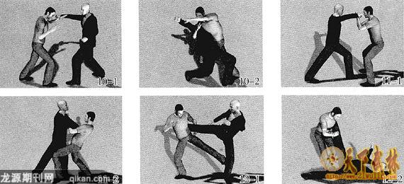 动作说明:双方交手,对手左脚在前右脚在后,突然用双拳自左右两侧以双峰贯耳之势袭击我上盘,来势凶猛。我双臂迅速屈肘外旋,以两腕部为力点自内向外分别磕挡其双手腕内侧(图11-1),紧接着,左脚上步进身,左腿屈膝抬起,以左膝盖为力点向上顶击对手裆部,同时双臂由内向外螺旋缠绕对手肘臂,身体后仰,锁别其肘关节(图11-2)。
