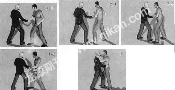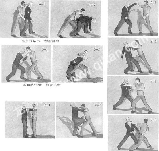 | 掐技是指用单手或者双手掐拿对手颈、咽喉、裆部等柔软部位以及一些要害穴位,致使其局部疼痛、麻木、丧失功能与反抗能力,从而达到控制对手的最终目的。 实用技法一掐三里穴 动作说明:双方对峙,对手用右手抓握住我右手腕,用力拉扯(图1-1);此时我迅速回拉右手,同时伸出左手,张开虎口,以拇指和食指猛掐对手右小臂三里穴,令其疼痛松手(图1-2)。 要领解析:右手回拉与左手掐穴动作要求配合协调,掐穴要准确有力。 实用技法二掐后溪穴 动作说明:双方对峙,对手用右手自上而下抓住我左手腕,欲翻拧擒拿(图2-1);我迅速用右手四指抠抓住对手右手拇指侧,拇指掐其右手掌后溪穴,令其疼痛松手(图2-2)。 要领解析:右手掐拿对手穴位时,左手要尽力回拉,掐拿要准确有力。 实用技法三抱腰掐颈 动作说明:双方交手时,对手突然猫腰向我扑过来,并伸出双手拦腰将我抱住,左右摇晃欲将我摔倒;此时我迅速伸出双手猛掐对手颈部、咽喉,令其窒息(图3)。 要领解析:颈部俗称“脖子”,乃头身之关联部位,前有咽喉,后有颈椎,左右密布经络、动脉,既是呼吸通道,又是神经通道,正所谓“咽喉要道”,掐卡此处,轻者可致其转动不灵,呼吸阻塞,重者可导致头脑晕眩,危及生命;掐颈时两手虎口要同时向上用力,力达十指,以拔断对手颈椎,同时臀部与腰部要配合后挺,以挣脱对手的控制。 实用技法四砍颈掐裆 动作说明:实战中我由敌人背后进行偷袭,在贴近对手时突然伸出右手由后面自下而上插入其裆部,并用力掐拿其生殖器,同时左掌用力向前下方砍劈对手后脖颈(图4-1);双手协同动作,致使其重心前倾向前扑摔(图4-2)。 要领解析:动作要求快速敏捷,出其不意,双手配合要协调,交错用力;提裆要求准确有力,力达指尖,劲力饱满,以令其疼痛难忍,屈服就范。 实用技法五缠肘掐颌 动作说明:双方交手,对手左脚在前、右脚在后,突然用右勾拳自下而上挑打我下颌,我迅速用左手向下、向内勾挡来拳,同时右臂伸直,自上而下插入对手右肘关节内侧(图5-1);紧接着右脚向前上一大步,插入对手两腿间,身体快速左转,右手外旋,由对手腋下穿过,缠肘的同时屈肘锁掐对手下颌,以令其下颌脱臼并仰身后摔(图5-2)。 要领解析:掐下颌时,拇指按住其颊骨处,其余四指抓其耳腮处,力达指尖;下颌分为阴阳关节,属联动关节,掐拿到位,可导致其下颌错位脱臼,疼痛难忍;缠绕与掐颌的动作要配合协调,上步转身要快速敏捷,转身后右腿要蹬直,拧腰发力,整个动作连贯顺畅,一气呵成。 实用技法六缠臂掐喉 动作说明:双方交手,对手左脚在前、右脚在后突然用左摆拳击打我头部,我迅速屈右臂,以右小臂向外格挡其左手腕(图6-1);紧接着重心前移,右脚向前上半步,右手臂由内向外螺旋缠绕对手左手臂,同时随上步进身,左手成爪一并向前伸出,用力锁掐对手颈部咽喉穴,力达指尖(图6-2)。 要领解析:咽喉穴位于颈前侧中央凹处,为气管之口,乃人之要穴,掐拿此穴可以起到点穴、闭气之效,令其呼吸困难,导致窒息;右臂缠绕速度要快,掐喉要准确有力,势如钳锁,上步进身时重心要相应前移,左腿蹬踏,上下肢动作配合协调,出手果断、刁钻。 实用技法七转身掐喉 动作说明:实战中我用右直拳击打对手上盘,不慎被其用右手叼抓(图7-1);对手抓住我右手腕后,进一步欲用双手拧拿我右臂,此时我顺势身体左转,右臂屈肘以化解其拧控之力,左手随转体向左后方快速伸出,以爪狠抓对手颈部,并用力掐拿其喉咙(图7-2)。 要领解析:转身速度要快,否则就会受制于人,要借转身之力挣脱对手的擒拿,掐喉要准确有力,稳、准、狠,动作连贯协调。 实用技法八防膝掐喉 动作说明:双方交手,对手主动进攻,趁我不备突然用双手抓住我双肩,并用力向后拉扯(图8-1);其继而抬起右腿,屈膝向上顶击我裆腹部,此时我快速反应,左脚向前迈进一步,身体重心前移,用左手向下拍按对手右腿膝盖,同时右手成爪快速伸出,直掐其咽喉,力达指尖(图8-2)。 要领解析:动作要求反应迅速,出手果断;拍按膝盖要快速有力,掐喉时右手要用虎口死死卡住对手喉咙处,力达指尖,令其气管受阻、窒息。