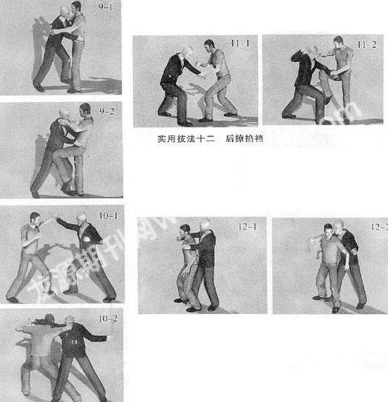 实用技法九掐喉顶裆 动作说明:实战中,对手突然前扑,伸出双手拦腰将我抱住,欲将我摔倒(图9-1);此时我迅速用双手由两侧夹击,共同掐住对手颈部,同时抬起左腿,屈膝以膝盖为力点向上顶撞其裆腹部,令其重创,松手放弃(图9-2)。 要领解析:动作敏捷,出手凶狠,双手掐颈时两大拇指要深深抠人其咽喉,以令其窒息,抬膝速度要快,发力准确到位;双手掐喉向后拉,左膝盖向前上方顶击,上下协同动作,配合协调。 实用技法十扛肘掐喉 动作说明:敌我双方交手,对手右脚在前、左脚在后,主动进攻,用右掌自上而下劈击我头部,我迅速伸出左手,以掌刃向外格挡对手右手腕部(图10-1);紧接着,身体快速左转,右脚向前上步,落脚于对手右脚后侧,彻底“吃”住对手下盘并向后撑趟,同时左手外旋成爪叼拿住对手右手腕部并用力翻拧,继而低头、俯身,将其右臂拉扛至我右肩及脖颈上,并用力向下拉扯其手腕,借肩颈部位向上扛别其肘关节,同时右手由其腋下穿过以鹰爪锁掐其咽喉,令其窒息(图10-2)。 要领解析:格挡要及时准确,力达掌刃,如刀般切砍对手腕部,劲力通透、饱满,击点稳、准、狠,令其手臂麻木;右腿插入对手身后,主要目的是控制其下盘,打乱其阵脚,拧腰顺胯,右腿一定要伸直,要与上身动作配合协调;掐喉出手果断,力达指尖,掐的同时要向前推撑;转身、上步、抗肘、掐喉一系列动作要求连贯协调,发力顺畅,手随身进,身手合一,一气呵成。 实用技法十一顶肘掐喉 动作说明:实战中,对手突然用左拳击打我腹部,我迅速用左手抓握住对手左手腕部,并内旋翻拧(图11-1);继而左手向左拉扯,令其肘尖翻转向下,同时身体向左转,屈膝抬起右腿,用膝盖向上顶击对手左肘关节外侧,右手成鹰爪,内旋(虎口向下)直取对手脖颈,用力掐锁其咽喉(图11-2)。 要领解析:动作要求出手果断,反应迅速,动作准确到位,劲力通透饱满;顶肘掐喉时,要注意保持自身平衡,支撑腿要站稳。 实用技法十二 后撩掐裆 动作说明:实战中,对手由我背后发起进攻,突然偷袭我,伸出双臂向前将我上身与双臂合抱起来,此时我迅速蹲身、屈膝,重心下沉,双臂猛然向上抬起,以挣脱对手的束缚(图12-1);紧接着身体略左转,左臂伸直,左手成爪用力向后、向下撩抓对手裆部,力达指尖,猛掐其生殖器(图12-2)。 要领解析:正如本势之名,探囊取物,垂手可得,左手向后、向下撩掐的动作既简单又实用,杀伤力强,对付背后搂抱偷袭,立竿见影;阴裆之物,乃生殖之器,脆弱要害,触之疼痛难当,实战中需谨慎施之,点到为止;如面对强敌悍匪,则应出手果断,一触即发。