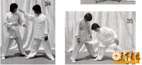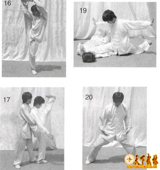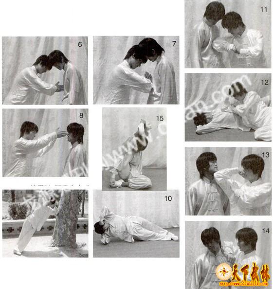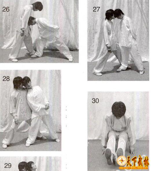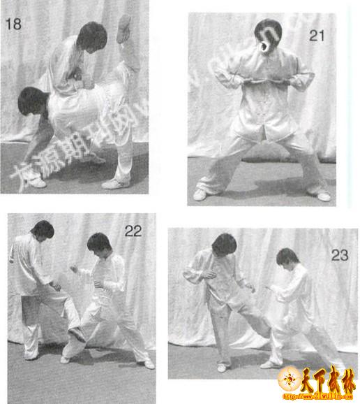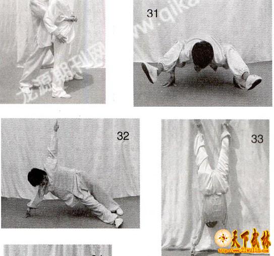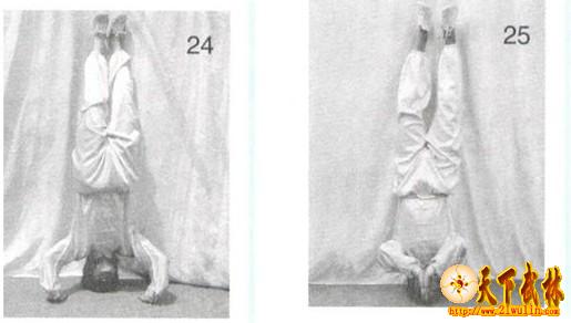 1 罗汉盘心 使用时,以肘关节顶击对方胸部或心脏。这是极其危险的打击,轻则会造成对方胸闷气短,重则造成对方胸骨碎裂或心脏损伤(图11)。 2 罗汉抱肚 使用时,以肘关节下砸对方腹部。这种打击会造成对方腹部神经丛损伤,甚至伤及肾脏(图12)。 3 罗汉挑旗 使用时,以肘关节向上挑击对方下颚。这种打击会造成对方下颚骨脱臼(图13)。 4 罗汉摆手使用时,以肘关节向内摆打对方太阳穴。这种打击会造成对方头晕目眩或休克(图14)。 三、抻筋拔骨功法及应用 (一)练功方法 抻筋拔骨功,简称“软功”。此功分为扳腿上头和朝天蹬两个阶段。 第一阶段扳腿上头 两腿盘坐,用手将一腿向头顶上方扳起,另一手紧握盘腿脚尖或脚腕,身体保持正直,自然呼吸,意守丹田(图15)。 [说明] 此功主要练习腿部柔韧性,扩大腿的活动范围。能坚持支撑20~30分钟,接行下式。 第二阶段朝天蹬 接上式,两脚开立,略宽于肩,以双手从体侧向上扳腿,使脚心向上,能坚持20~30分钟,则此功成(图16)。 [说明] 为了增加难度,也可在梅花桩上练习。 (二)应用方法 抻筋拔骨功练好了,可以增加腿法的踢击长度和增强进攻突然性,往往会出奇制胜,给对方造成意想不到的伤害。 1 朝天上香 使用时,以正踢腿向后攻击对方头部。这是一种意想不到的打击,会造成对方面部受伤或嘴角流血(图17)。 2 倒踢绣球 使用时,以脚向后撩踢对方头部。这种打法会造成对方头晕目眩(图18)。 3 二郎救母 使用时,身体腾空跳起,以脚跟向下劈砸对方头部。这种打法会造成对方面部或头骨损伤(图19)。 四、吸腹吊裆功法及应用 (一)练功方法 吸腹吊裆功,简称“裆功”。此功分为提气吸腹和提气吊裆两个阶段。 第一阶段提气吸腹 或坐或站,双目微闭,气沉丹田,将丹田混元气向上提起,使腹部收缩,以鼻吸气,如此反复练习(图20)。 [说明] 此功主要练习腹部的收缩能力,能使丹田混元气收提自如。 第二阶段提气吊裆 接上式,或坐或站,双目微闭,气沉丹田,将睾丸向上提起并吸入腹中,使腹部收缩,以鼻吸气,如此反复练习(图21)。 [说明] 能使睾丸自由收提入腹中,则此功成。 (二)应用方法 提腹吊裆功的应用方法,主要表现在对裆部的防御方面。 1 扣膝裹裆 使用时,以膝关节向内扣挡防御对方攻击我裆部的腿法(图22)。 2 摆膝护裆 使用时,以膝关节向外摆挡防御对方攻击我裆部的腿法(图23)。 五、头倒栽碑功法及应用 (一)练功方法 头倒栽碑功,简称“头功”。此功分为头手倒立和头倒立两个阶段。 第一阶段头手倒立 以头和两手顶地,成等腰三角形,进行倒立,自然呼吸,意守涌泉(图24)。 [说明] 此功主要练习头手的支撑力和身体平衡。能坚持支撑20-30分钟,接行下式。 第二阶段头倒立 接上式,以头顶地,进行倒立,能坚持20-30分钟,则此功成(图25)。 [说明] 为了增加难度,也可在梅花桩上练习。 (二)应用方法 头倒栽碑功的应用方法,主要表现在以头撞击对方要害部位,往往会出奇制胜,一招制敌。 1 头撞金钟 使用时,以头向前撞击对方胸部。轻则使对方胸闷气短,重则使对方胸骨损伤(图26)。 2 罗汉撞面 使用时,以头向下撞击对方面部,会使对方鼻口流血,面目全非(图27)。 3 摇头摆尾 使用时,以头向体侧摆击对方面部(图28)。 4 仰天长笑使用时,以头向后磕击对方面部(图29)。 六、指禅行走功法及应用 (一)练功方法 指禅行走功,简称“指禅功”。此功分为指禅支撑功、指禅行走功和指禅倒立功三个阶段。 第一阶段指禅支撑功 以两手五指或三指或二指或一指顶地,使身体腾起,自然呼吸,意守丹田(图30)。 [说明] 此功主要练习指的支撑力和点压能力。能坚持支撑20-30分钟,接行下式。 第二阶段指禅行走功 接上式,以两手五指或三指或二指或一指顶地,使身体腾起行走,能坚持20-30分钟,此功则成(图31)。 [说明] 为了增加难度,也可在头顶进行负重练习。 第三阶段指禅倒立功 接上式,以两手五指或三指或二指或一指顶地,使身体腾空倒立,能坚持20-30分钟,则此功成(图32、33)。 [说明] 为了增加难度,也可在梅花桩上练习。 (二)应用方法 指禅行走功的应用方法,主要表现在指的点打方面,会给对方造成极大的伤害。 1 二龙取珠 使用时,以食指和中指分别插击对方双眼(图34)。 2 哪吒探海 使用时,以拇指、食指和中指成爪抓击对方裆部。(图35)