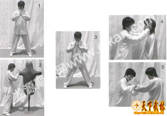 | 童子功必须要从小开始培养,也就是从娃娃抓起,循序渐进,随年龄的增长功夫日益长进,终臻大成。笔者师叔释行明武功深厚、技艺超群,4岁时便进入少林寺随德印法师学习少林童子功,后又得德禅法师精心培养,历经1 5个春秋的锤炼,练就了一身高超的童子功夫。笔者遵照师叔释行明教诲,将此功整理成文,以传后世。 一、童子拜佛功法及应用 (一)练功方法 童子拜佛功简称“拜佛功”。此功分为拜佛求仙、合掌念经、童子拜佛三个阶段。 第一阶段拜佛求仙 两脚稍开立,两小臂分别从体侧向上托起置额前,掌心向上,以鼻吸气;然后屈臂两掌合十,置于胸前,双目垂帘,以鼻呼气,意守丹田(图1)。 [说明] 此功心静自然,意念集中以后腹部会产生“肠鸣”,此现象过数日即可消失。 第二阶段合掌念经 面对木人桩,两脚稍开立,两小臂分别从体侧向上托起置额前,掌心向上,以鼻吸气;然后,屈臂两掌合十,夹住木人桩手臂,以鼻呼气,以腰带劲,重心稍下沉,练至合掌木断为止(图2)。 [说明] 此功练习合掌、沉气、夹臂的协调统一。 第三阶段童子拜佛 两人相对站立,距离约3米远,助手持红砖抛向练习者,练习者两手合掌,于胸前夹住红砖,以鼻呼气,发虎啸音,以气助力,练至合掌砖断为止(图3)。 [说明] 此功练习合掌发劲,以声助力。 (二)应用方法 童子拜佛的攻击效果十分独特,往往给对方造成极大伤害,希望读者在练习和使用时要慎之又1真! 1 双风贯耳 使用时,以两手相对拍打对方双耳。这是极其厉害的打击,会振穿对方耳膜,使其神经受到冲击或耳内出血(图4)。 2 金刚伏虎 使用时,以两手相对拍打对方攻击的手臂或小腿。这种打击会造成对方手臂或小腿骨折(图5)。 3 观音指路 使用时,两手合十,以指尖穿插对方喉节、心脏、肝脏、睾丸等要害部位。这种打击会造成对方极大伤害(图6)。 4 僧推佛门 使用时,两手合十,以掌外侧同时向前推撞对方心脏。这种打击会造成对方心脏损伤(图7)。 5 童子拜佛 使用时,两手合十,以指尖向前点击对方眼睛。这种打击会造成对方失明(图8)。 二、罗汉睡觉功法及应用 (一)练功方法 罗汉睡觉功简称“睡功”。此功分为扶桩睡觉和撑肘睡觉两个阶段。 第一阶段扶桩睡觉 两脚并立,上体向前,两手展开,慢慢扶着木桩或大树;然后,左手扶撑木桩或大树,屈肘握拳,以肘尖抵压木桩或大树,拳眼顶住耳前:右手附着在另一侧耳前,两眼微闭,气贯左肘。自然呼吸,意守丹田(图9)。 [说明] 此功主要练习肘的支撑能力,能坚持支撑20~30分钟,接行下式。 第二阶段撑肘睡觉 接上式,以肘尖抵压在坚硬的水泥地面上,能坚持20~30分钟,此功则成(图10)。 [说明] 为了增加难度,也可在梅花桩上练习。 (二)应用方法 罗汉睡觉功攻击效果主要表现在肘关节上,由于肘关节属于人体梢节尖端,坚硬度比较好,加之罗汉睡觉功的练习,更增加了其功力,一旦用于实战会给对方造成极大伤害,希望读者在练习和使用时要慎之又慎!