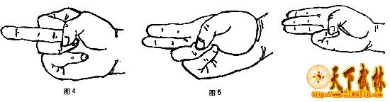 歌诀曰: 鸡嘴勾锥锋锐利,点钻勾刺亦法奇。 善点听宫鹳口穴,手足背尾与列缺。 背部诸穴至命门,内外膝眼并肋季。 点中成擒鬼哭泣,莫忘勾鼻牵十里。 3、练法: 面对盆内所盛的米粒,运气3循,气贯食指,向盆内演练点插,每日2次,每次50—100下。1个月后改点石砂,2个月后改点铁砂,3个月后改点木人,每次300—500下。 四、金针指点穴法 1、手型握法: 中指伸直,其余四指内屈,拇指内扣,紧压食指和无名指点刺对方的要害穴位(图4)。 2、用途: 金针指主要用于点刺人身孔眼和软组织处的诸穴,如:眼、鼻孔、天突、耳道、天枢、气海等穴。 歌诀曰: 中指亦属五峰第,单出亦称金针指。 点中如就针插纸,霎时暴客命即息。 穴选鼻孔双眼珠,耳孔长突与天枢。 鸠尾中脘气海穴,左右膝眼并血池。 3、练法: 点物同鸡嘴法,仅在3个月,开始演练钻法,即点中旋钻入内,日久皆威力无穷。