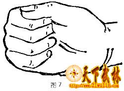 七、瓦楞拳点穴法 1、手型握法: 食、中、无名、小指内屈,四指末节急扣掌内,不能超过手掌第一道横纹,拇指封压食指孔眼,使手型如瓦楞形,用拳楞点打对方(图7)。 2、用途: 瓦楞拳主要用于点打胸部、头部前后诸穴和四肢要害骨络,如百会、上星、印堂、头维、后顶、颤中、乳根、肝俞、膈俞、风市、肩井、骨骨禺等。