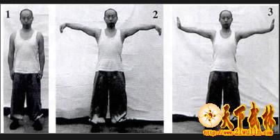 大悲拳注重内外兼修,在练法上强调气沉丹田,沟通任督。 一、内功法 1 预备式 两足左右开立,距离同肩宽,身体自然直立,两臂自然下垂,手心向内;头项正直,眼向前平视,口轻闭,舌抵上腭(图1)。 立身要中正安静,全身放松,不得有丝毫僵劲,含胸拔背,两臂下垂,要松肩坠肘,手指自然微叉,手心要空,要开裆敛臀,尾闾中正,气沉丹田,神贯于顶。 大悲拳预备式的步法、身法、手法和其要点要求,无一不是内功(气功)的要求。这就给拳术的开式和全套动作,打下了良好的气功基础。