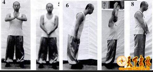 2 双垂掌式 两手拇指自然叉开,其余八指自然靠拢,然后两臂徐徐平举,与肩平,成双垂掌式(图2)。 双臂平举不可一高一低,不得有前有后,要求与肩、胸成直线,随两臂徐徐左右平举,气沉督脉吸入脑海,两臂要明三节,即肩关节、肘关节、腕关节都要松开,以使气血贯通。在两臂上举时,其着力点在手腕上端,腕就像吊着一桶水似的那样沉重。肘部还应有下坠之感,肩部要切实松开,使气贯于手指,并有发麻、发热和热流冲撞十指感。 3 立掌式 接上式,由肩部再往下沉松,逐渐缓缓以内劲将双掌翘起,形成立掌(图3)。 五指自然叉开,手心要空,中指微翘,以引气上行。此时要沉肩、坠肘、坐腕(塌腰),以使气贯于十指,随缓缓立掌动作,气沿任脉归于丹田。 上述两式,系一吸一呼。一吸气入脑海,一呼气入丹田。一呼一吸形成任督循环,与所谓的“小周天”循环相似。 4 合掌式 接上式,双臂立掌以小臂缓缓向前合拢,指肚相对(先以中指相对,后食指、无名指、小指及大拇指相继而对),掌心合紧,拇指与喉齐,要松肩坠肘,徐徐向胸前回收,深吸气于脑海,形成合十手(图4)。 5 下垂掌式 接上式,手尖向前渐渐下垂,合掌下垂至裆部,要松肩坠肘,长呼气,形成下垂掌,气沉于丹田(图5)。 以上是大悲拳开始的五个立身动作,在全套复杂的动作中,下盘功夫繁多的情况下,也要掌握深长的腹式呼吸。做到呼吸与动作相结合,以形成任脉、督脉循环。 6 贯气式 面南而立,本身肌肉放松,两脚平行站立,与肩同宽,两手下垂于两侧,舌抵上腭,眼平视,两牙齿轻叩,形神安静,此同预备式。 身体稍前倾,腿与身体成120度角。用嘴吸入一口清气,意想清气吸入体内,呼气时,意想体内浊气从口呼出,如此反复3次;再恢复预备式;然后再用嘴吸气,吸气时发出“服”声,把气从牙缝吸入肺,同时,两手向上、向外展。至两掌高举于头上时,两掌掌心相对,与此同时,两脚跟也随之提起(图6、7)。 当提到最高时,吸气满,然后闭气,两掌向下作弧,掌指相对,掌心向下,经印堂、天突、膻中至下丹田,意想胸部之气随手下压沉入丹田,同时,脚跟也随之下落(图8)。 当脚跟落地时,闭气满,两掌向外展收于两腰侧,掌心向上,同时丹田之气也收于两腰侧,呼气(用鼻轻轻呼出),恢复预备式。如此共做9次。 然后收功,即将脚跟提于最高度,放松脚部,使身体自然下沉,震动全身。共做3次。