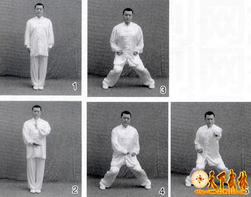 一、冲山炮单式练法 1 起势 两脚并拢成并步,两手置于身体两侧,身体直立,全身放松,目视前方(图1)。 【要点】 思想集中,做三呼三吸吐纳术。 2 童子拜佛 上动不停,左手置于胸前,掌指向上,右掌置于腹前,掌心向上,目视左掌(图2)。 【要点】 全身放松。 3 罗汉抱拳 上动不停,左脚横向开立,略宽于肩,脚尖稍内扣成开步,然后两腿屈膝下蹲成马步;同时,两掌变拳,抱于两侧腰间,拳心向上,目视前方(图3)。 【要点】 以鼻出气,气沉丹田。 4 左冲山炮 上动不停,右拳前翻,拳心向下,屈臂横于腹前;左拳向前拧转击出,拳眼向里,拳面向前,以腰带劲,抖腰震臂,力达拳峰,发虎啸“hā”音;同时右拳回收,抱于右侧腰间,拳心向上,目视左拳(图4、5)。 【要点】 丹田省劲,一触即发。 5 右冲山炮 上动不停,左拳前翻,拳心向下,屈臂横于腹前;右拳向前拧转击出,拳眼向里,拳面向前,以腰带劲,抖腰震臂,力达拳峰,发虎啸“hā”音;同时左拳回收,抱于左侧腰间,拳心向上,目视右拳(图6、7)。