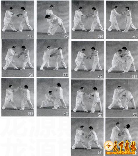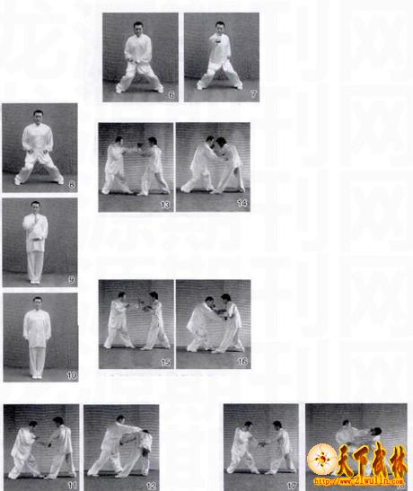 【要点】 叼腕要准,下劈要狠。 6 白虎拦路 我突然以左冲山炮向对方胸部发动攻击,不料对方以右拳向外挂开我左手臂,以求破解;此时我左脚向左前斜上步成横裆步,同时以右扣山炮横击对方左侧太阳穴,使其昏迷甚至休克(图21、22)。 【要点】 上步要快,横击要狠。 7 猛虎下山 我突然以左冲山炮向对方头部发动攻击,不料对方以左小臂向上架起我左手臂,以求破解;此时我迅速撤回左拳,两脚向前上步,屈膝深蹲成半马步,同时以左栽山炮向下偷袭对方裆部,使其疼痛难忍或睾丸损伤(图23、24)。 【要点】 上步要快,偷袭突然。 8 猿猴献果 我突然以左冲山炮向对方右侧肋部发动攻击,不料对方以右手直叼我左手腕,以求破解;此时我迅速将左手腕外旋旁叼对方右手腕,同时两脚向前上步成半马步,以右挑山炮从下向上挑打对方右肘关节,使其折断(图25、26)。 【要点】 旁叼要快,挑打要狠。 9 猕猴摘桃 我突然以左冲山炮向对方腹部发动攻击,不料对方以右掌向外消截我左小臂,以求破解;此时我两脚向前上步成半马步,以右撩山炮从下向上撩击对方裆部,使其疼痛倒地(图27、28)。 【要点】 上步要快,撩击要狠。 10 乌云盖顶 我突然以左冲山炮向对方胸部发动攻击,不料对方以左小臂从外向内拦截我左拳,以求破解;此时我借对方身体内旋之际,两脚向前上步成半马步,以右盖山炮从上向下盖打对方后脑,使其昏迷倒地(图29、30)。 【要点】 上步要快,盖打要狠。 11 燕子钻天 我突然以左冲山炮向对方腹部发动攻击,不料对方两小臂交叉向下按压我左小臂,以求破解;此时我借对方全力防守身体前俯之际,以右钻山炮从下向上钻打对方下颌,使其颌骨脱臼(图31、32)。 【要点】 钻打要狠,拧转发力。 12 天官抱瓶 我突然以左冲山炮向对方腹部发动攻击,不料对方右小臂向下格挡我左小臂,以求破解;此时我借对方下格之际,右脚向左脚前进步成半马步,以右横山炮向外横击对方下颌,使其颌骨脱臼(图33、34)。 【要点】 进步要快,横击要狠。 13.风扫落叶 我突然以左冲山炮向对方胸部发动攻击,不料对方使用右砸山炮向下猛砸我左小臂,以求破解;此时我右脚迅速向左脚前进步成半马步,同时以右扫山炮向外横扫对方颈部,使其休克(图35、36)。 【要点】 进步要快,横扫要狠。 14 举锤砸石 我突然以左冲山炮向对方胸部发动攻击,不料对方右手向外旁叼我左手腕,以求破解;此时我左手迅速外旋反抓对方右手腕,并向外旋拧,两脚向前上步成半马步,同时以右砸山炮向下猛砸对方右肘关节,使其关节折断(图37、38)。 【要点】 反抓要快,砸肘要狠。 15 醉打金枝 我突然以左冲山炮向对方头部发动攻击,不料对方右小臂向外格挡我左拳,以求破解;而且此时对方采取防上打下的方法,迅速以左冲山炮向我腹部猛击;我左脚向前上步成半马步,以右挂山炮向外猛力挂打对方左手腕关节,使其关节损伤(图39、40)。 【要点】 上步要快,挂打要狠。 16 一石二鸟 我突然以左冲山炮向对方头部发动攻击,不料对方两小臂同时夹击我左手腕,以求破解;此时我左脚迅速向前上步成左弓步,同时以右冲山炮向前猛击对方腹部,使其腹部产生剧痛(图41、42)。 【要点】 上步要快,冲打要狠。 17 火光四射 我突然以左冲山炮向对方头部发动攻击,不料对方双手从外向内缠绕我左手臂,以求破解;此时我左脚迅速向前上步成半马步,同时以右弹山炮向上翻打对方面部,使其泪流满面(图43、44)。 【要点】 上步要快,翻打要狠。