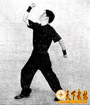 1.四指握拳势 【练法】 双腿立定,宽如肩阔。眼向前平视,牙关咬合,嘴唇闭住,舌舔上腭。两手握拳,拳心向后(或可向下),大拇指尖贴住大腿。 每呼吸完毕,拳握一紧,不能放松。愈握愈紧,即每当呼气两拳愈握愈紧,再吸气时两拳不要放松原来的紧度,再呼气时尽可能加强两拳的紧度。直至36次呼吸完毕,才可放松(图1)。 【要点】 肩要沉,胸勿挺,引气下沉丹田。行之数月手力自然增加。 初练先做6次呼吸,两手即放松,以后逐渐增加。总要自然,不得勉强。 2.双掌下按势 【练法】 双腿立定如前势。眼向前平视,牙关咬合,嘴唇闭住,舌舔上腭。两手掌左右下按(按于身旁两侧,不可贴身,但也不要过远),掌心向下,掌尖向外,左右手指翘起。 掌愈按愈下,即在每次呼气时两手掌尽量紧张地按下,不能放松,至36次呼吸完毕才可放松(图2)。 【要点】 本势增长手力腕力。沉肩,含胸,气沉丹田。掌下按时手指翘起。按下时切记要保持膝节不屈。 3.双掌前推势 【练法】 双腿立定如前势。眼前平视,牙关咬合,嘴唇闭住,舌舔上腭。两掌向前推出,掌心向前,腕节内挺,臂高同肩,两掌大拇指与食指尖相对成三角形。 每一呼吸完毕,双掌前推,手指同时拗入。愈推愈前,愈拗愈入(近身),直至36次呼吸完毕才可放松(图3)。 【要点】 本势增长手力与指力。初练次数、方式可仿前势。 手臂微屈,气沉丹田,手指拗入。练此势前最好活动一下手指关节。 两手掌推出前不能大幅回收,要求原位暗劲推出。推出时躯体不可前俯后仰,务令在紧张的状态下保持平正与宁静。 4.左右托掌势 【练法】 双腿立定如前势。眼前平视,牙关咬合,嘴唇闭住,舌舔上腭。两手掌左右平伸,掌心向上,掌尖向外,臂高同肩。意想有重物置于两掌之中,需要用意托起。 每一呼吸完毕,用意把掌上托。只用意念,两掌均不动,愈托愈重地继续下去,练至36次呼吸可止(图4)。 【要点】 本势增长臂力。沉肩,收胸,气沉丹田,双手伸平,不要下坠。 两掌托起重物只是意想,诱导两掌及前臂的肌肉渐渐紧张起来,不要使两掌的位置有任何移动。 5.双掌开合势 【练法】 两腿立定如前势,眼前平视,牙关咬合,嘴唇闭住,舌舔上腭。两手合十当胸,掌尖向上,掌心相合,腕节外挺、下沉,两大拇指贴身。 吸气时两手渐渐分开(两大拇指沿身移动),呼气时两手渐渐再合,练至36次呼吸可止(图5、6)。 【要点】 沉肩,含胸,气沉丹田,两手开合时手指拗出,大拇指轻轻贴身,不离肋,不提起。 本势合掌当胸,连续开合,能使肺部一张一缩,无病者练之健肺强身,若有肺病者还可有良好的调养效能。 专用本势可以治疗一些慢性病,如肺结核、慢性胃肠炎等。但练习时一定要注意呼吸的松静、柔和、均匀,如若过猛,有病之身必再受创。 6.左右撑掌势 【练法】 双腿立定如前势。眼前平视,牙关咬合,嘴唇闭住,舌舔上腭。两掌分左右撑开,掌心向外,掌尖向上,臂高同肩,指尖拗向头部。每一呼吸,双掌渐渐撑紧,愈撑愈紧,如是连续36次呼吸,直至完毕才可放松(图7)。 【要点】 本势增长臂力和腕力。沉肩,含胸,气沉丹田,保持均匀的腹式呼吸。双掌撑开时,身体要保持正直。 7.双掌上撑势 【练法】 双腿立定如前势。牙关咬合,嘴唇闭住,舌舔上腭。双手反掌向上正撑,掌心朝天,两掌大拇指与食指相对成三角形,面门向天。手向上撑高,愈撑愈上,直至36次呼吸完毕为止(图8)。 【要点】 气沉丹田,头上仰,眼看手背,胸腹不可凸出,手指拗落。 本势增长臂力和腕力,强健颈项,并可动胃调肠帮助消化,驱除胸中浊气。 8.双掌下垂势 【练法】 双腿立定如前势。牙关咬合,嘴唇闭住,舌舔上腭。两掌自然置于身侧两旁。 上身向前慢慢弯曲,两掌轻松下垂(掌心向后为宜),两肩微微松沉,不用拙力(图9)。 身下弯时呼气(两手与上身一同下垂),起立时吸气(还原站势)。两掌愈垂愈下,如不觉疲劳可连续36次呼吸乃止。 【要点】 沉肩,收胸,气沉丹田。呼吸如过于急速,起立时立定可再行一呼一吸后再下垂。动作不能过猛,宜悠宜匀。 本势增长腰力和腹力,并对减少腹部过剩脂肪有特效,能减腹脂、收细腰围。如腹部脂肪过剩,每日习之一月后可收大效。 以上8势为熊氏易筋经第一级练法,第5势和第8势两势略有动作,余势无动作。第一级练习时不可无力,无力则练而无功;不可过猛,过猛则多耗伤力,且易丢功。务要纯任自然,久习则气力不期而自至。 9.弓步拗身势 【练法】 本势有左右两势,以右势为例说明。 右脚向右踏开一步,成右弓步势,身体向右拗。右掌置背后,左掌置头前,两掌心皆向外,两腕节皆外拗。眼看左脚跟,脚跟不要离地。此势站成,意在腰腹,牙关咬合,嘴唇闭住,舌舔上腭,练习36次呼吸(图10)。 【要点】 因为身体扭转,腰部肌筋必然紧张,多习此势腰力雄健异常,并对腰痛病有良好转化作用。 功夫加深后,可以渐渐增加腰节扭转度。或可直接增加,即在一开始时就达到一定扭度,这样呼吸时全身均不再动。或者在每一呼气时渐增扭度,但不可过猛。双掌伸开幅度可大些可小些。 左势与右势只是左右拗身不同,其他相同。本势弓步拗身叠骨,若童年练习更显奇功。 10.握拳上仰势 【练法】 本势有左右两势,以右势为例说明。 双腿如前,成右弓步,身躯挺直。右手握拳提高,屈肘置头上,拳心向下,头节上仰,眼看右手心;左手握拳垂下,与地面成45度,并向稍距左胁后侧方拉下,拳心向后。牙关咬合,嘴唇闭住,
