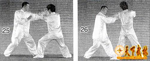 8.罗汉担柴 我突然以左劈山炮向对方头部发动攻击,对方两小臂向外拦截我左手臂以求破解;此时我左手顺势从下向上反抓对方左手腕向怀中拉拧,同时两脚向前上步成“半马步”,以右挑山炮向上挑击对方左腋窝,使其左臂麻木失去知觉(图25、26)。 9.小龙戏水 我突然以右劈山炮向对方胸部发动攻击,对方右掌向外横推我右手臂以求破解;此时我趁机向右后翻身转体,右脚向左脚后上步成“插步”,以左撩山炮从下向上偷袭对方裆部,使其疼痛倒地(图27、28)。 10.临阵脱逃 我突然以左劈山炮向对方腹部发动攻击,对方双手向下抓按我左手臂以求破解;此时我左脚向前上步成“弓步”,以右盖山炮向下猛击对方左肘关节,迫使对方脱手,否则其肘关节必折(图29、30)。 11.仙鹤升天 我突然以左劈山炮向对方腹部发动攻击,对方双手向下抓按我左手臂以求破解;此时我左脚向前上步成“弓步”,以右钻山炮向上钻打对方下颌,使其颌骨脱臼(图31、32)。 12.暗渡陈仓 我突然以右劈山炮向对方头部发动攻击,对方双掌向外缠绕我右手臂以求破解;此时我右拳顺势变掌反抓对方右手腕向外拧旋,随即两脚向前上步成“半马步”,左腿挤靠对方左腿,以左横山炮向前、向外横打对方右腋窝,使其肩关节脱臼(图33、34)。 13.棒打马腿 我突然以左劈山炮向对方头部发动攻击,对方两小臂交叉向上架住我左手臂以求破解;此时我右脚向右前横上步成“横裆步”,以右扫山炮向下、向外横扫对方右腿膝关节里侧,使其膝关节损伤或脱臼(图35、36)。