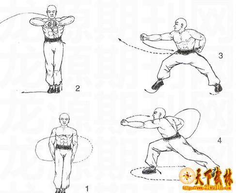 甘凤池少林拳,一种秘传的少林拳法,宗归少林南派,据传来自清代“江南大侠”甘凤池:“凤池,江南江宁人,为天下拳棍名师,拳勇冠天下。得南少林朝元大师亲炙,身如铁石,臂力千斤,手能破坚……” 1、预备式 面南背北,立正站立,两臂自然下垂,五指并拢,掌心贴靠大腿两侧;二目平视前方(图1)。