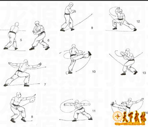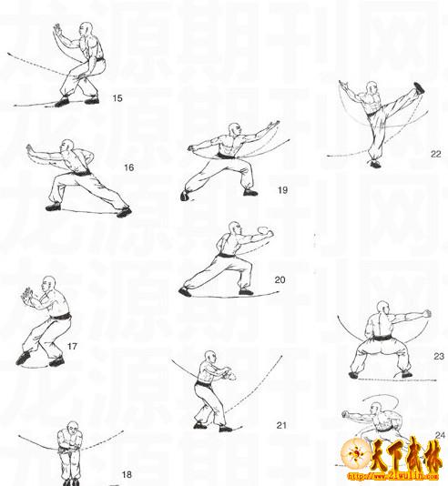 6、黄羊探蹄 接上式,左脚向前进半步,左腿略屈;右脚不变,唯右腿略伸直成左高弓步;同时,右掌前伸附于左腕上,左掌先向左再向右画一小平圆抓掳变拳回带,拳心向下;目视左拳(图9)。 两手不变,右腿向前踹出,高与胸齐,目视右脚(图10)。 7、流星拳 接上式,右脚屈腿回收落步,上体左后转,左脚外摆成左弓步;同时,右掌变拳与左拳随上体左后转向左横击,右拳置于右侧前方,拳心向下,高与右肩平,左拳置于身体左侧后方,拳心亦向下,高略低于左肩;方向朝西南;目视右拳(图11)。 8、打虎式 接上式,右脚向前迈进一大步,屈膝下蹲,左脚不变,唯仆腿里扣成左仆步;同时,右拳由前向后向下再向前向上画一立圆屈肘上架,置于头部右侧上方,拳心斜向上;左拳由后向前按下,置于裆部前下方,拳眼向里,拳心向下;方向朝西南;目视左拳(图12)。 9、黄莺落架 接上式,身体右转,左脚向前方迈一步,右脚不变,唯脚跟提起成拗步;同时,右臂屈肘向前顶出;左拳变掌向右小臂外下侧拍击;方向朝西,目视前方(图13)。 10、右侧踹腿 接上式,右臂屈肘,右掌由下向上向右画一半圆,置于右侧后方,掌心向前,虎口向上,高略低于右肩;左掌由右向左分开,置于左后侧,虎口向上,掌心斜向前,略高于左肩;同时,右脚由后向前侧踹,脚尖里扣;目视右脚(图14)。 11、朝天一炷香 接上式,右脚向前落步,左脚遂迈进半步,脚尖点地,两腿屈膝下蹲成左虚步;同时,右掌由后向前向上挑起,置于右前方,五指朝上,虎口向后成立掌,高与眉齐;左掌由左上方回收,置于左大腿外侧,掌心向下,五指向前,虎口向内成俯掌;目视右掌(图15)。 动作不停,左脚向前滑步,右脚遂向前迈进一步成右弓步,同时,右掌变拳屈肘回收置于右胯旁,拳心向上,拳眼向外;左掌由后前推掌,掌心向前,高与眉齐;目视左掌(图16)。 12、十字手 接上式,右脚回收一步,置于左脚里侧,两腿屈膝下蹲;同时,左掌屈肘收回,置于胸前,右拳变掌亦置于胸前与左掌相交,左掌在上,右掌在下,五指均斜向上,两掌背相对;目视两掌(图17)。 13、大鹏展翅 接上式,两脚向前落步,两脚相并,屈膝下蹲,身体跃起左转;同时,两掌在小腹前相交,两掌心相对;目视两掌(图18)。 动作不停,左脚向左前方迈进一步,左腿屈膝下弓,右脚不变,唯脚尖里扣前顺,成左弓步;同时,左掌小臂外旋向左横扫,置于左前方,掌心向上,高与眉齐;右掌小臂内旋向前,由前向右向后横扫,置于身体后侧,掌心斜向下;目视左掌(图19)。 14、合盘手 接上式,步形不变,唯右脚尖里扣前倾;同时,左掌变拳屈肘回收,置于左胯旁,右掌变拳向前平冲,拳眼向上,高与肩平;目视右拳(图20) 动作不停,右脚向前迈进一步,脚尖点地,左脚不变,成右高虚步;同时,右拳变掌屈肘绕一小平圆置于胸前,掌心向下成俯掌;左拳亦变掌,置于右掌下,两掌相抱,掌心相对;目视两掌(图21)。 15、斜踹山门
