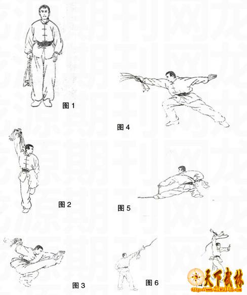 起身后,左右抽鞭向前疾走,动作同图6和图7(图15,图16)。