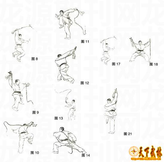 右手抖鞭时,力达鞭梢,转身跳转迅速,定式稳健,蹿蹦跳跃一气呵成,要表现出少林拳法身法之妙。