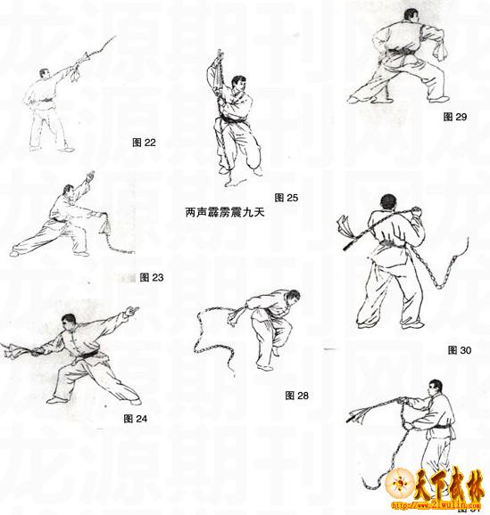 接上式,左手鞭响后,鞭交右手,右脚蹬地向右跳起,转体一周,同时右手撤把将鞭抡成一直线,左手握住下鞭身,右手换把接住鞭上半部,发声(图28)。
