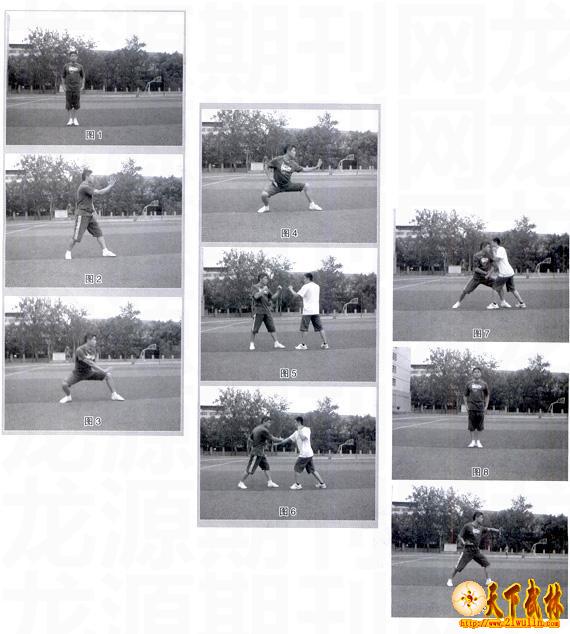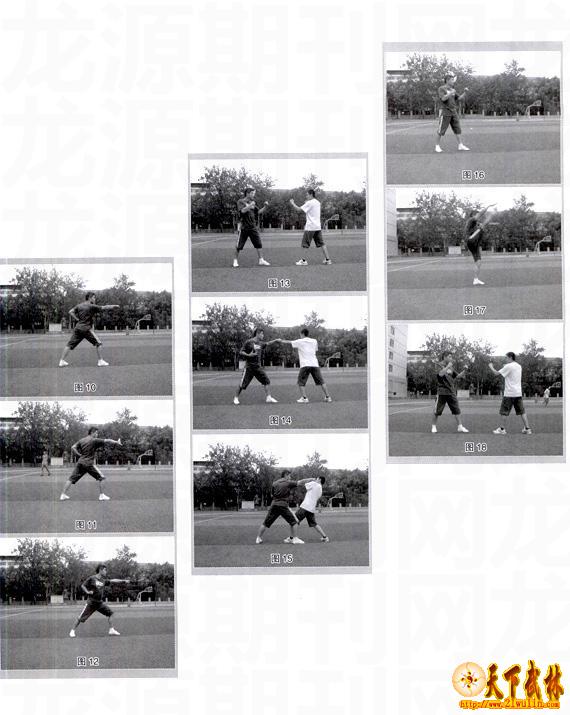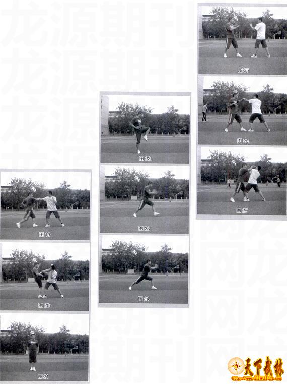 | 1、提手 预备姿势站立(图1),左脚上左迈步,身体左转,右拳变掌由右、向上、向左、向下外旋;同时,左拳变掌从右大臂外侧向前挑出,掌心朝外,掌指朝下,在右掌收回腰间一刹那间,左掌快速上挑成提手,步子成四六步型,目视左手(图2-4)。 实战技法 (1)双方格斗姿势站立(左脚在前)(图5),当对方以左拳或右拳向我头部攻击时,我便迅速上左步,用右掌向左格挡下压,同时右掌从大臂外侧向前划出,挑掌击对方裆部,致使对手裆部受伤,失去战斗力(图6-7)。 要点:上步格挡下压、挑掌要协调一致,快速有力。 2、两来穿 预备姿势站立(图8),左脚向左迈步,同时左拳变掌由右向左做拦手(左掌心朝上向右移到左胸处时外旋,掌心朝外,拇指朝下,向左拦手),身体左转上右脚成右弓步冲右拳,左掌变拳收回腰间,目视右拳;右拳变掌外旋抓握收回腰间,同时上左步成左弓步冲左拳,目视左拳(图9-12)。 实战技法: 双方格斗姿势站立(左脚在前)(图13),当对方以左直拳攻击我时,我迅速以左直拳拦截抓握对方左手腕或手臂,同时快速上右步冲右直拳打击对方头部或太阳穴等部位,致使对手头部受伤(图14-15)。(右脚在前,方向相反) 要点:外旋抓腕有力,上步冲拳快速打击,步法与冲拳协调一致,一气呵成。 3、外摆脚 格斗姿势站立(图16),两臂向两侧手伸,翘腕竖掌,掌指向上,一脚向前半步,直立支撑,另脚勾紧向另侧起踢,接着向同侧划弧甩摆,脚面要摆击手掌,左右相同(图17)。 歌诀:双脚开立两臂展,足斜上蹋到肩腕。 左右进行支撑稳,目前平视持志练。 实战按法: 双方格斗姿势站立(图18)(右脚在前,左脚在后),当对手以右直拳或摆拳攻击我时,我迅速用右拳挡击或上架,同时蹋起右腿向右摆击对手头部或肋部,致使对手受伤或失去战斗力(图19-20) 要点:挡击、上架与踢腿摆击要协调一致,快速有力,一气呵成。 4、十字手 预备姿势站立(图21),身体左转上步成左弓步,两拳变掌从腰间经胸前交叉向前推出,左手在上,右手在下,目视双手,掌指不能高过鼻尖(图22-24)。 实战技法: 十字手也是传统实战格斗姿势(图25),因此,我以十字手为格斗姿势(左脚在前),对手以现代散打姿势为格斗姿势,当对方右拳攻击我时,我迅速左上步以左掌外旋抓握对手右手腕或拨击对方右拳。同时右手掌插击对手咽喉或右手掌变两指插击对手眼睛,或砍击对手脖颈致使对手受重伤,失去战斗力(图26-27)。 要点:抓握、插击、砍击都要快速有力,一气呵成。 5、高跨 预备姿势站立(图28),左脚向前半步,脚尖点地成高虚步,两拳从腰间打出,左拳向上、向右经右胸、向左斜下方击出,同时右拳向下、向左经左胸、向上架于额头右侧,目视左侧(图29-31)。