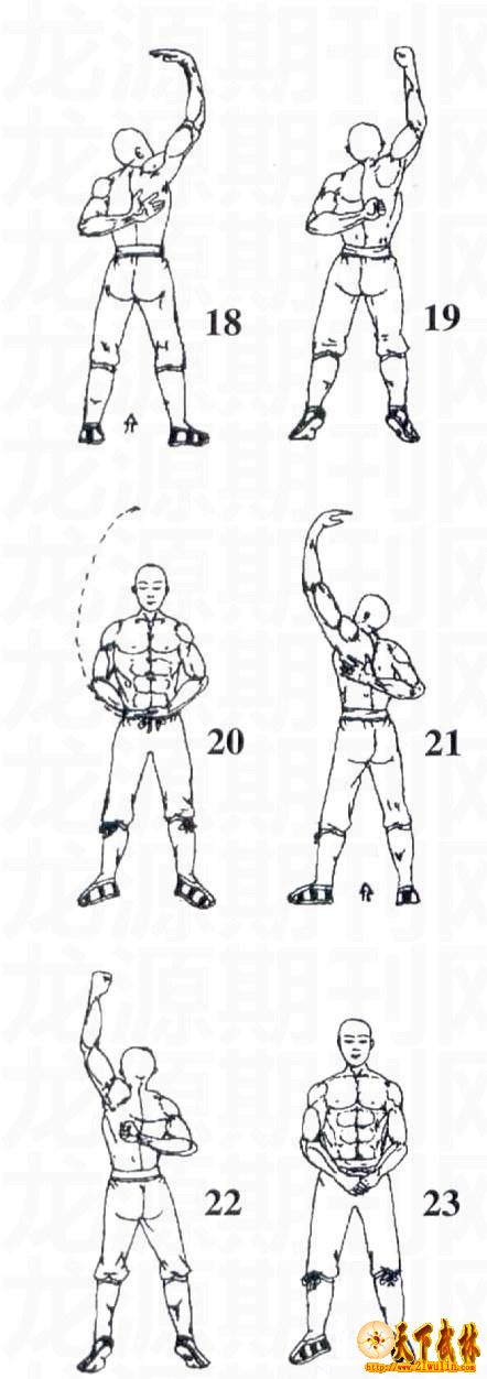 1.韦驮一献杵 【歌诀】 立身期正直,环拱手当胸。 气定神皆敛,心诚貌亦恭。 【练法】 韦驮,是佛教中的一位守护神,相传其神力惊人。杵是韦驮所使用的兵器。本套功法的前三势主要取意于韦驮将杵献给佛祖时那毕恭毕敬、庄重严肃的一个动作过程。 自然站立,两脚自然并拢,全身舒松,头往上顶,双目微合,舌尖轻舐上腭,双臂垂放体侧,双手指尖触于两大腿外侧并微屈,腹部微收,膝微挺。此即“立身期正直”之意。然后作逆腹势呼吸,默数12~24次(图1)。 然后,双手掌由下向内翻(图2)。 向上抬臂,在上抬臂时两掌指尖渐渐合拢,两臂屈成抱柱之状,至手与胸平时停住,手心向内。至此时,气刚好吸满,并以意贯气达于两臂及掌指,此即“环拱手当胸”(图3)。 接着,两掌朝胸前收拢,至天突穴位置时,将掌翻转成掌心向下(图4)。 将气吞下,然后双手压至丹田前,同时呼气(图5)。 左手劳宫穴贴于丹田,右手掌握于左掌背,意守3~5分钟(图6)。 待丹田发热,口中生津时,将口中之津吞下,意送入丹田,逆腹势呼吸12~24次。此即“气定神皆敛,心诚貌亦恭”。 2.韦驮二献杵 【歌诀】 足趾拄地,两手平开。 心平气静,目瞪口呆。 【练法】 承接上势,两手松开,吸气,两手贯劲下按至髂骨下止,然后将气呼出(图7)。 接着,两手同时翻掌,配合吸气,从小腹上托至胸前(图8)。 接着,两小臂内旋,两掌上翘相合,手指朝上,掌心相对,相距约10cm,配合呼气的同时,翻双掌由内至外竖掌,指尖向上,掌心向前(图9)。 接着,配合呼吸之际,双掌贯劲,缓缓向前方推出,直至两手与肩平(图10)。 将气呼出后,再吸气,两掌朝左右分开,两掌慢慢伸平,掌心向下,至两臂分展成一字平肩时止(图11)。 随即闭息,两手坐腕翘掌,二目圆睁,瞪视正前方,同时足跟提起,使两脚前掌或趾尖(初学用脚前掌)撑地,腿膝挺直,两掌向左右撑劲(图12)。 逆腹势呼吸12~24次后,两足跟落地,放下双手,平意静息。 3.韦驮三献杵 【歌诀】 掌托天门目上观, 脚尖着地立身端。 力周腿胁浑如植, 咬紧牙关不放宽。 舌可生津将腭抵, 鼻能调息觉心安。 两拳缓缓收回处, 用力还将加重来。 【练法】 两手内合收至丹田前(图13)。 然后配合吸气,提到胸前,双掌指尖相对,由内向外同时翻掌,掌心向上,指尖相对,如托重物,向头顶上方托举,头也随之仰望(图14)。 将气呼出后,两臂内旋,使两掌翻腕成掌心向下,二目注视劳宫穴,咬紧牙,足跟抬起,全身力量靠两脚前掌支撑,身体平稳而不可动摇,舌顶上腭,用鼻调息作逆腹势呼吸12~24次(图15)。 数息完毕,两手握拳,配合吸气的同时,缓缓下落至腰际的同时,足跟也落地,肘向上提劲,两腋胁用劲夹力,如夹重物一般。两拳距腰约10cm处停住,配合呼吸数息,每吸一口气,两拳及腋胁紧劲一次,共数49次(图16)。 然后松手、松体,自然呼吸,此即后两句口诀的练法。 4.摘星换斗